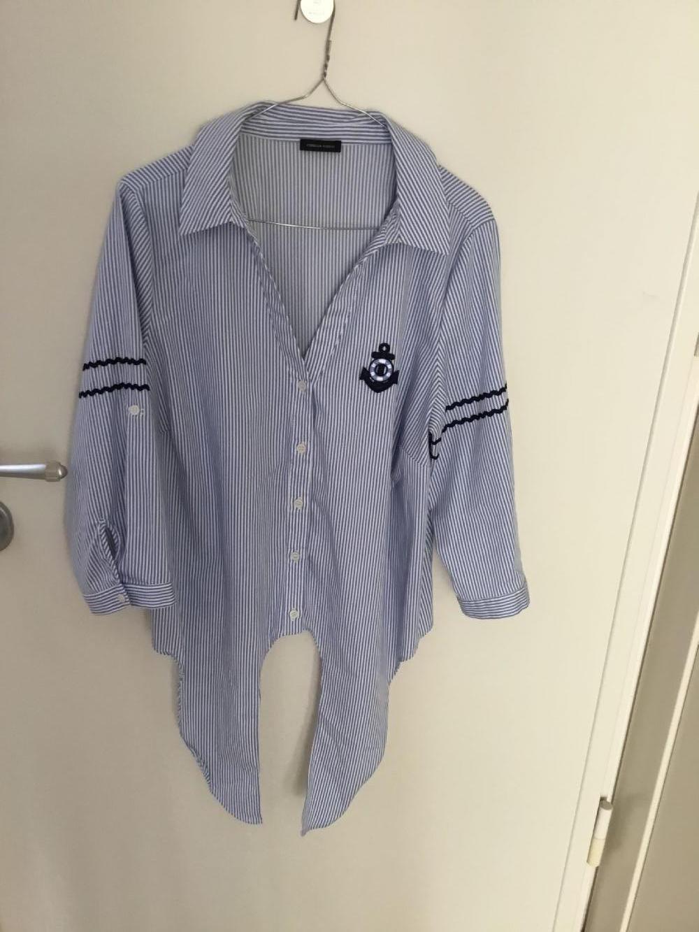 Descrizione:Camicia a righe bianche e azzurre, con code annodabili davanti.