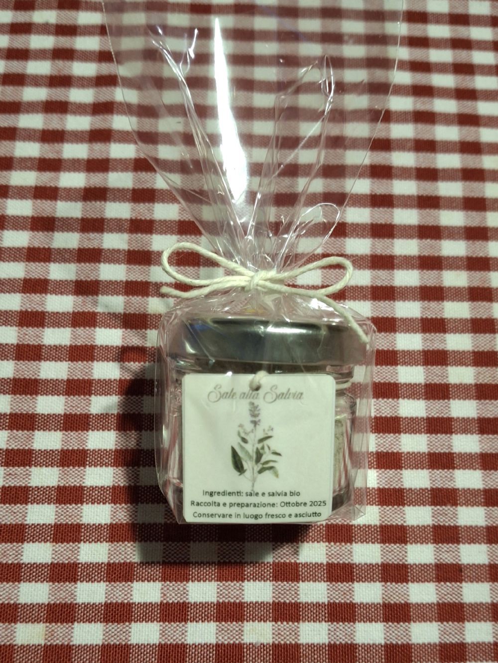 Descrizione:Due ingredienti: salvia bio del mio orto, essiccata e tritata nel mixer con sale.