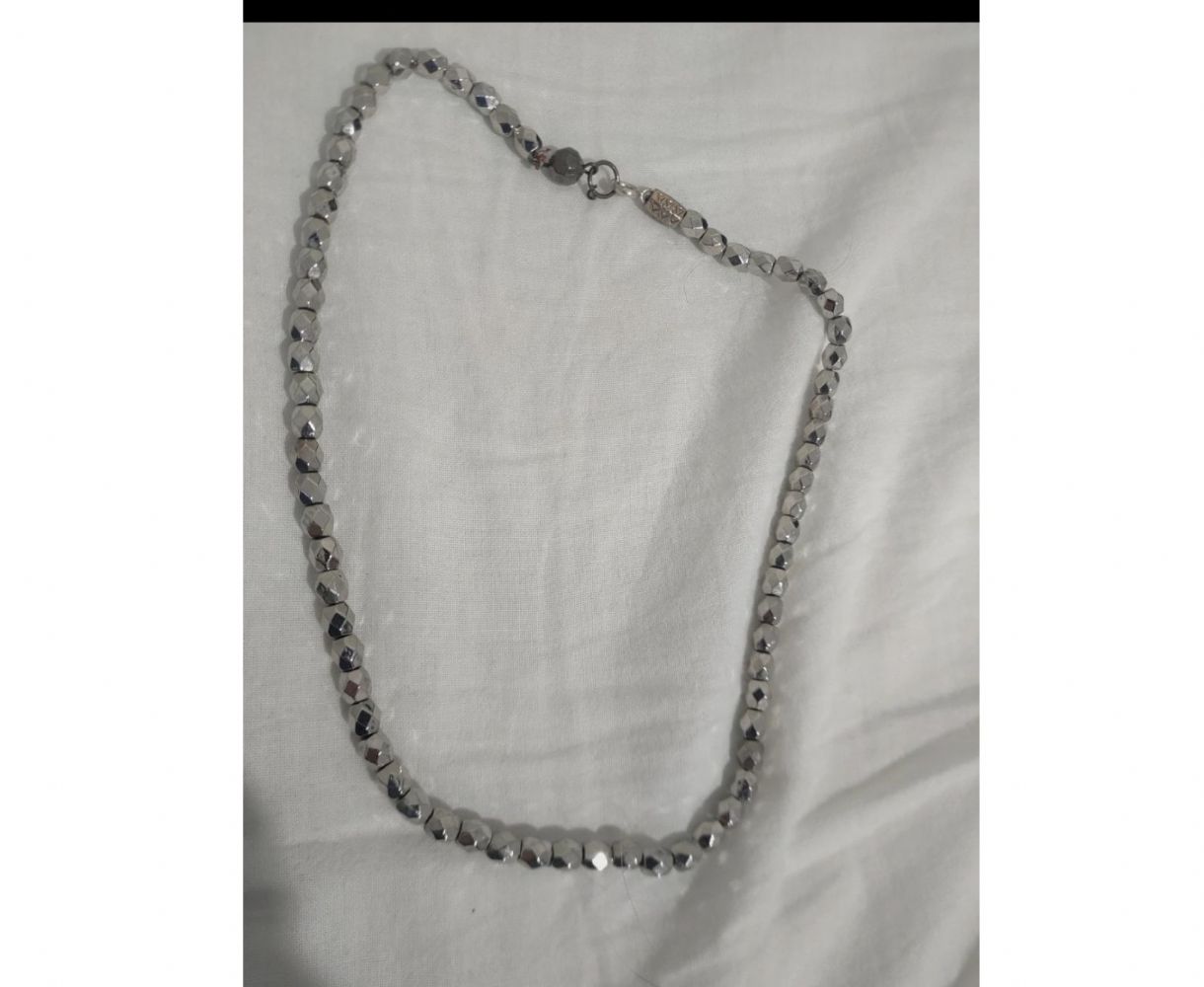 collana girocollo, perline argentate sfaccettate. Direi in plastica: molto leggera.