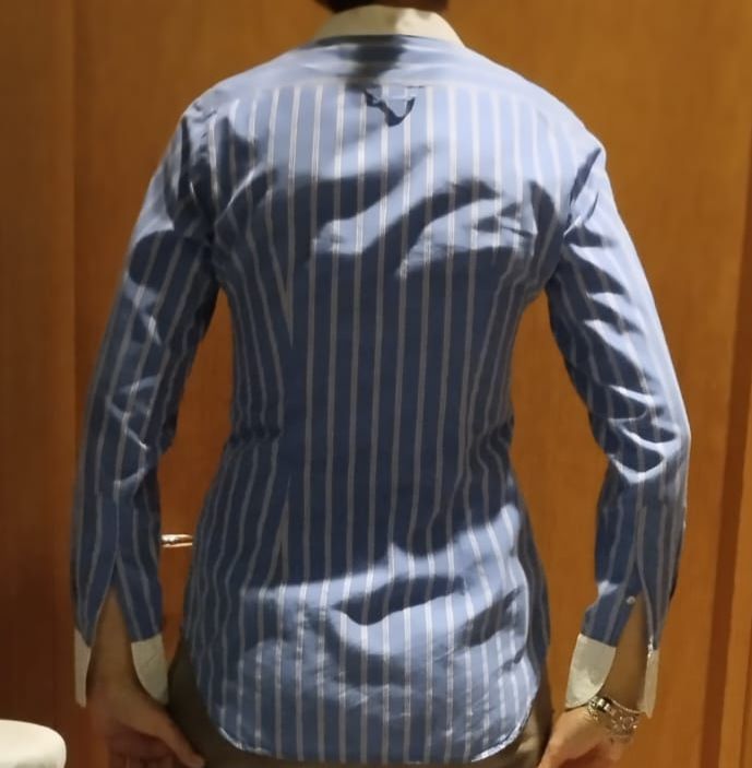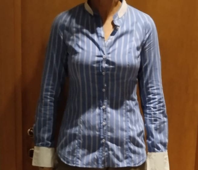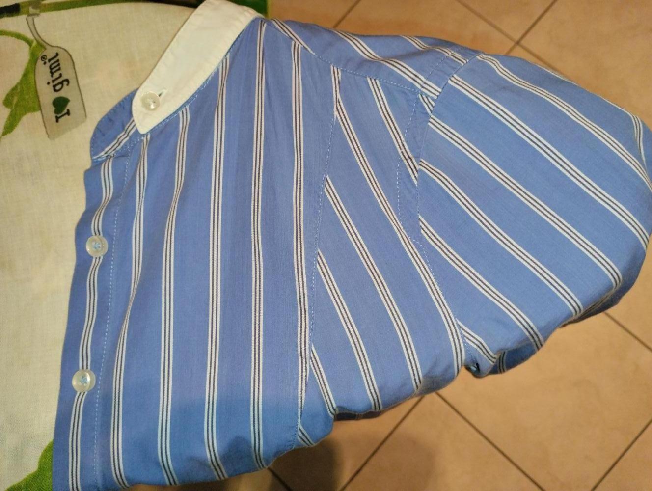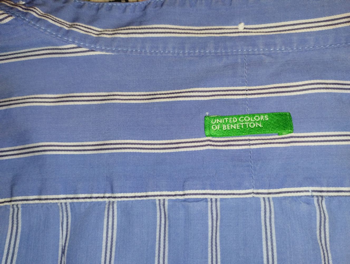 Descrizione:Camicia Benetton in puro cotone blu fantasia a righe, con polsini bianchi e colletto alla coreana.