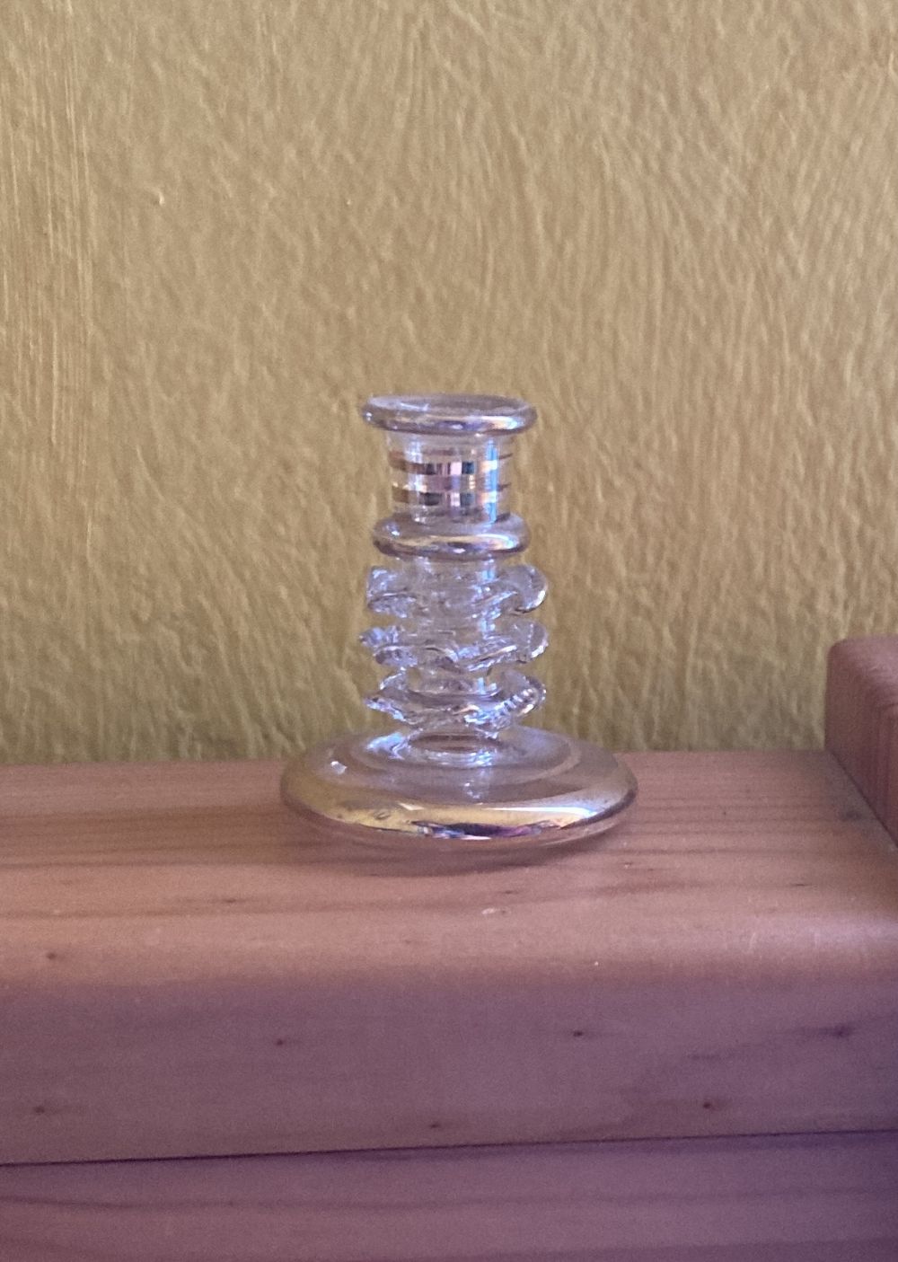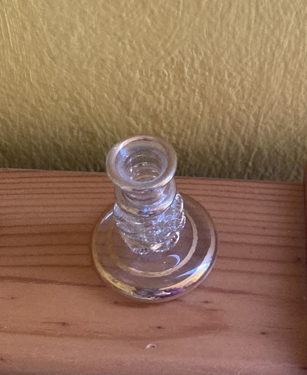 Micro vaso in vetro, trasparente con finiture dorate, altezza 4 cm circa.