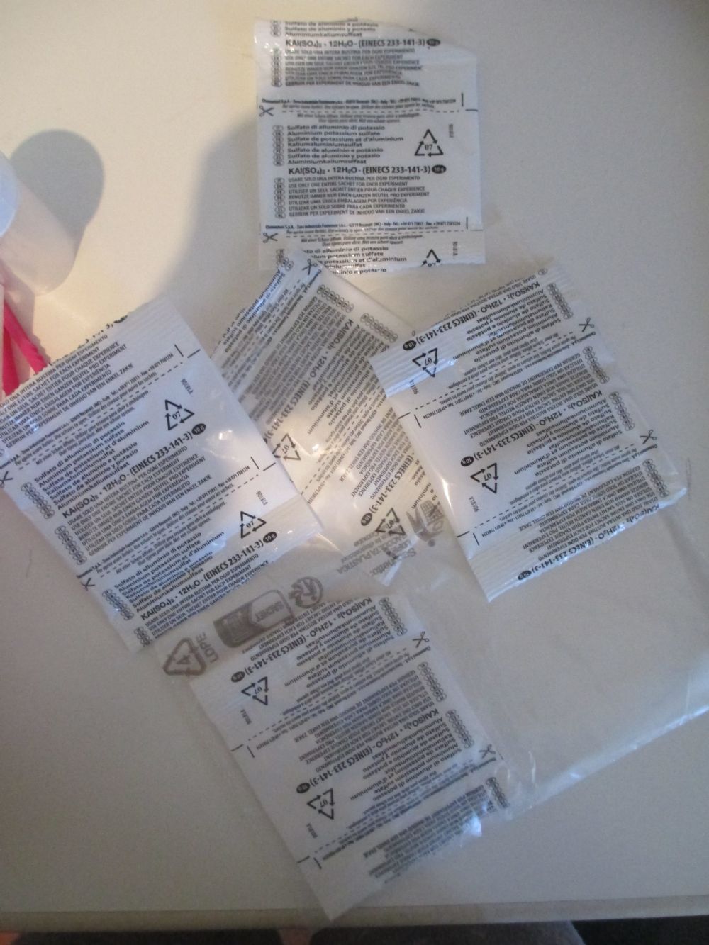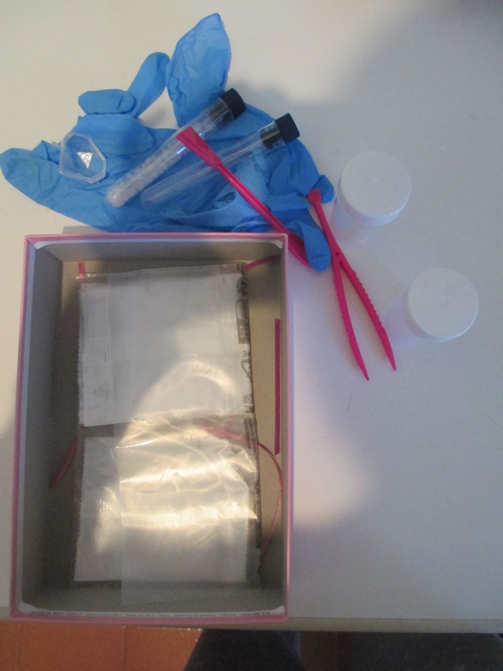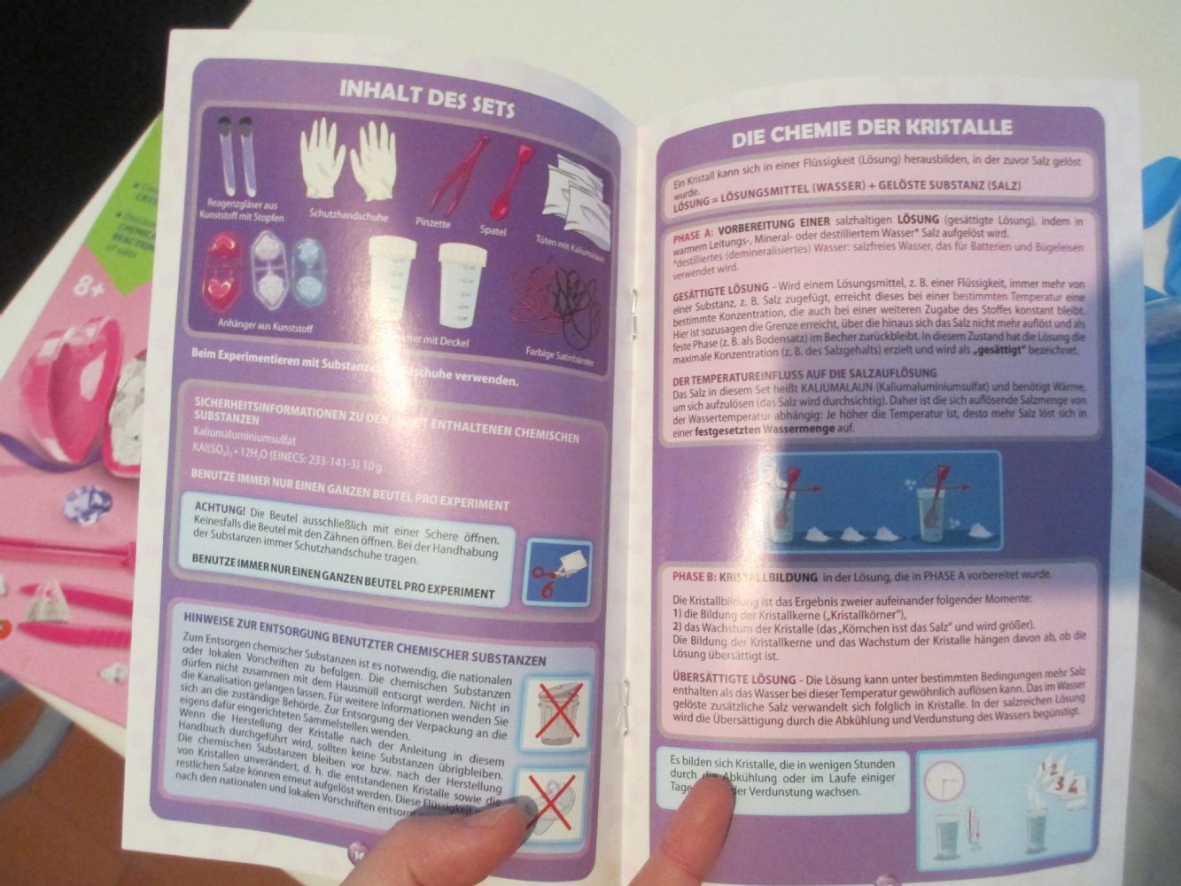 C'è il libretto delle istruzioni, dei nastrini, due provette di cui una già riempita di cristalli, un paio di guanti, due contenitori, pinzette, cucchiaio/spatola e cinque confezioni di sali.
