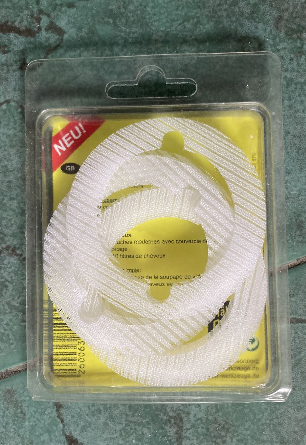 Descrizione:Ferma i capelli prima che finiscano nello scarico della vasca da bagno. Sono cerchi di velcro. Confezione mai aperta. Misure in foto.