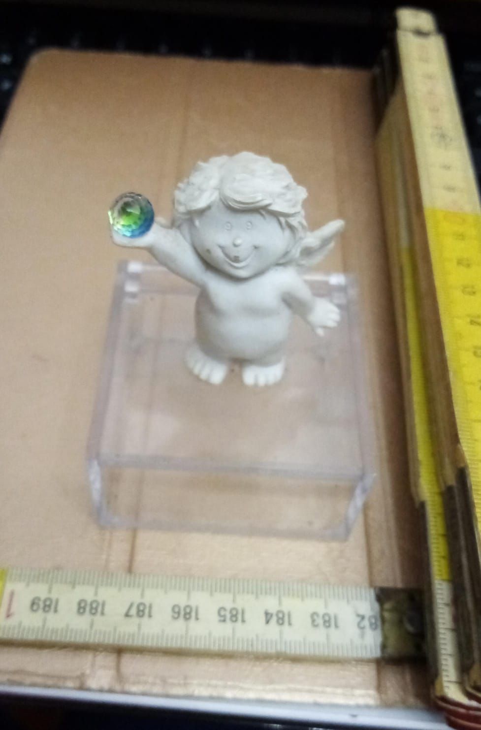 Scatolina in plexiglass con sopra un angelo in plastica con in mano una sfera di cristallo