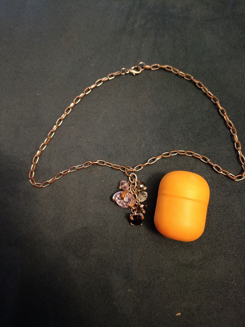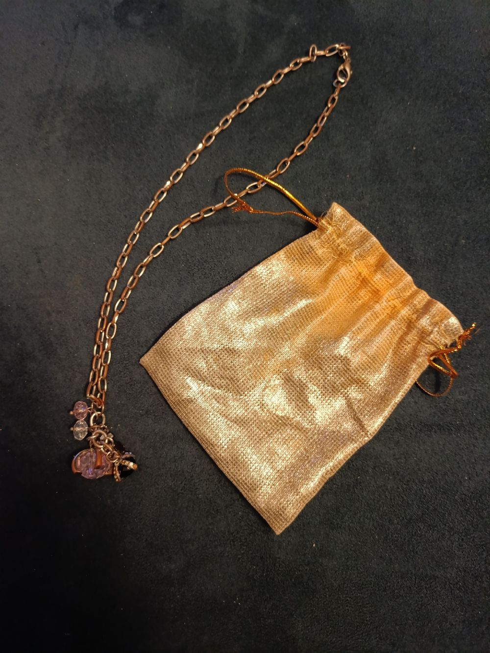Descrizione:In metallo (non so quale) con 6 ciondoli di diverse misure e colori. Con sacchettino. Nuova