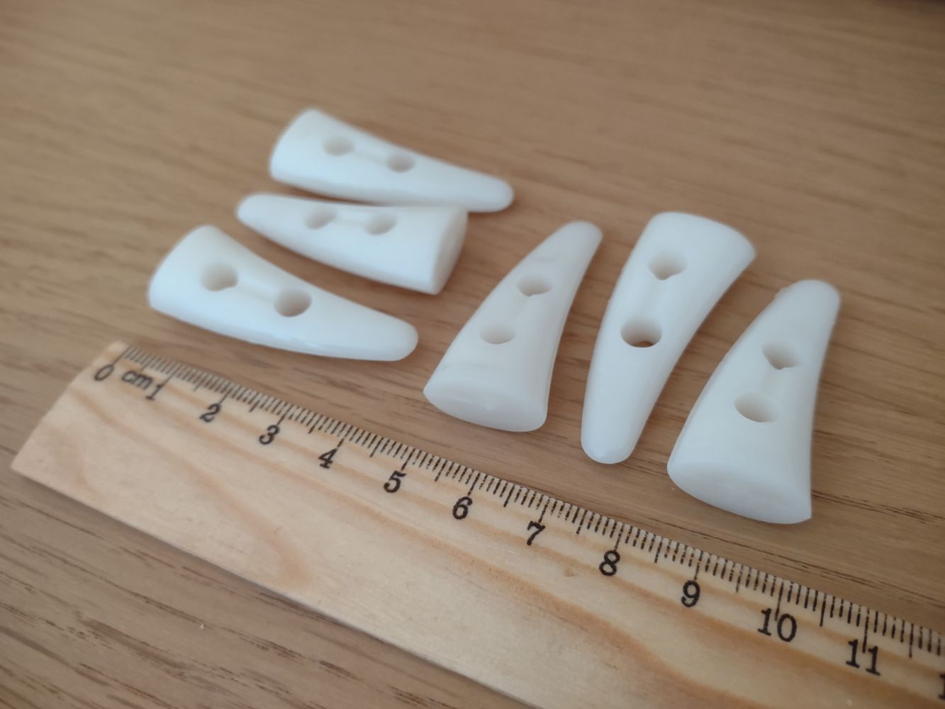 Descrizione:Cedo 6 bottoni a cornetto per la chiusura con alamari. Realizzati in plastica color avorio, mai utilizzati. Metto in scambio come "usati poco" in quanto sfusi senza confezione