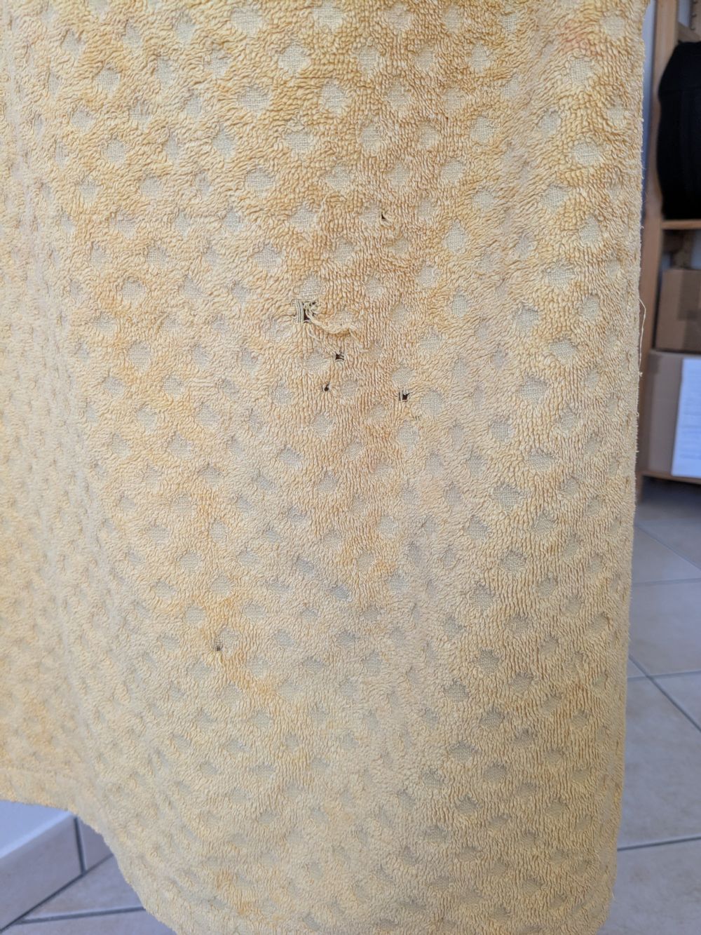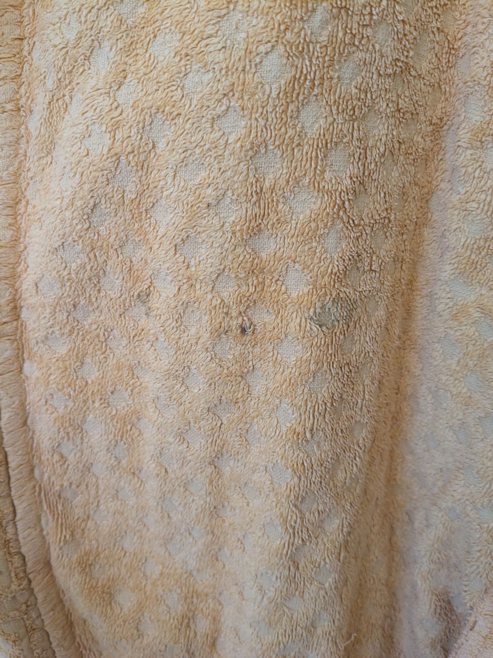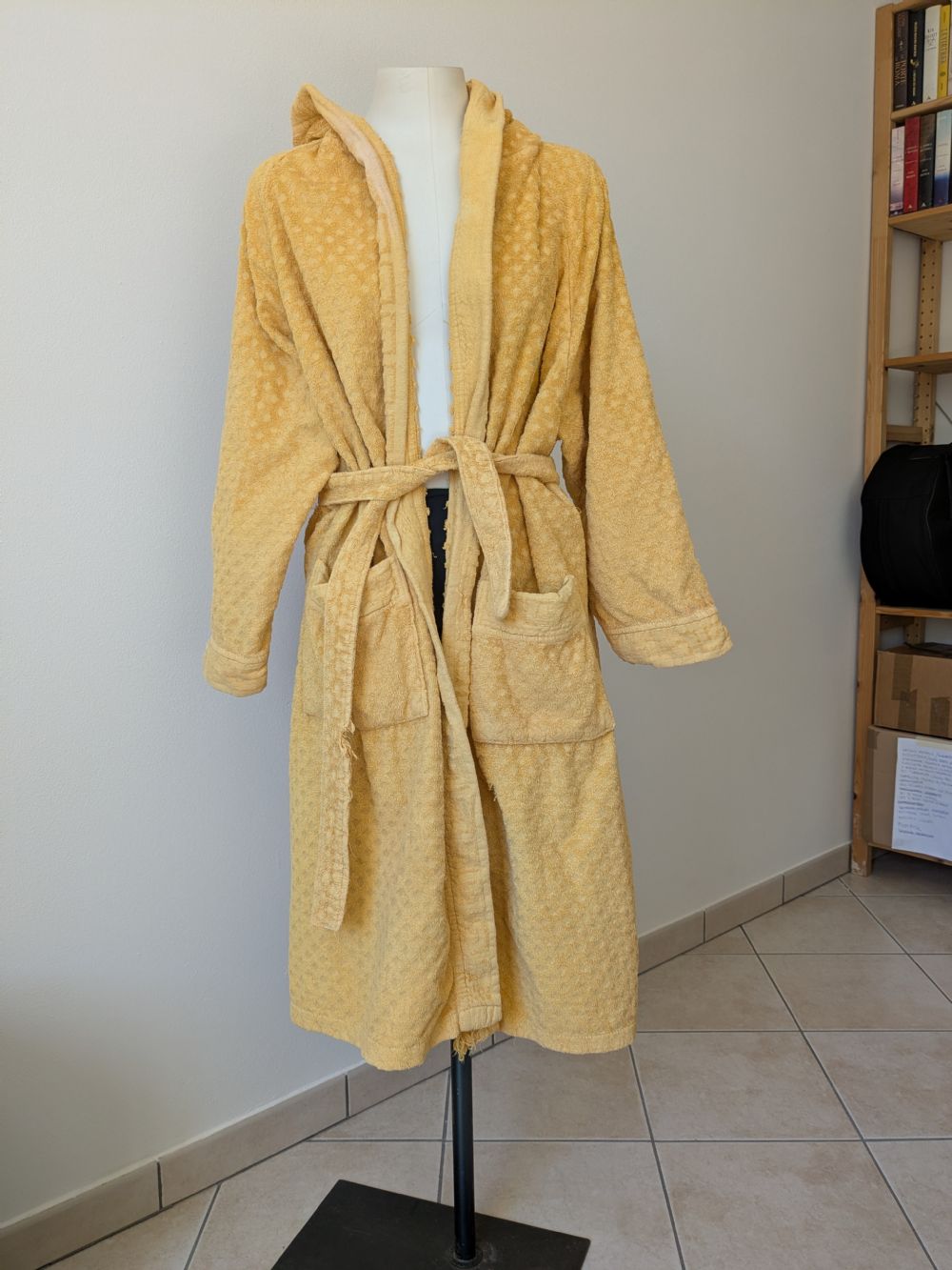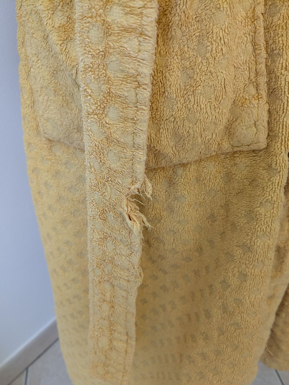 Descrizione:Accappatoio in spugna di cotone con cintura e tasche. Usato tanto, ma ancora sfruttabile. I difetti sono una macchiolina sul petto lato sinistro (fotografata), cintura sfrangiata in un un punto (fotografata), tessuto liso in alcuni punti (fotografato esempio)