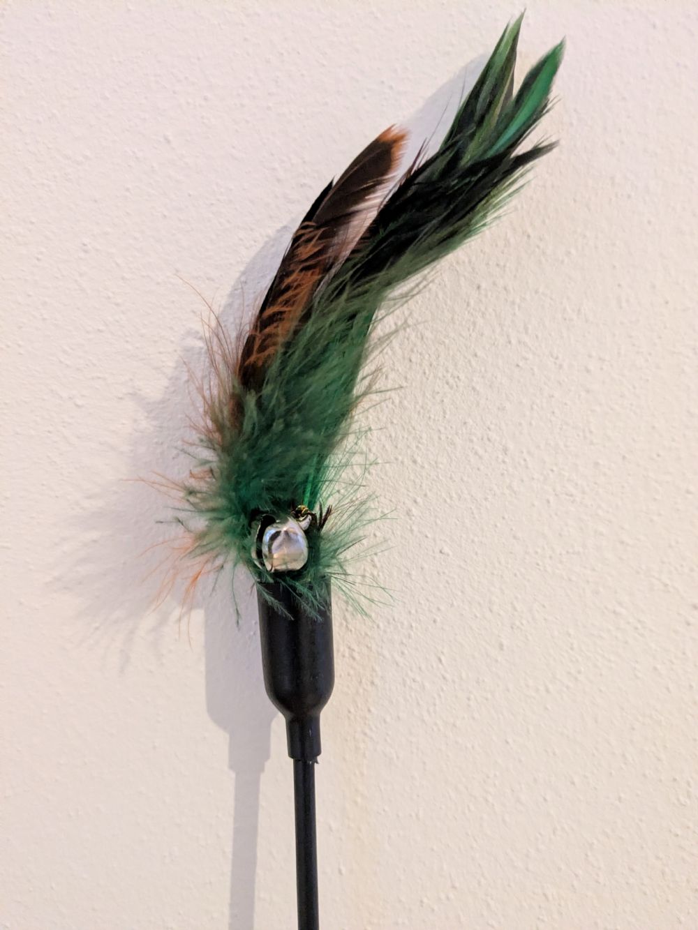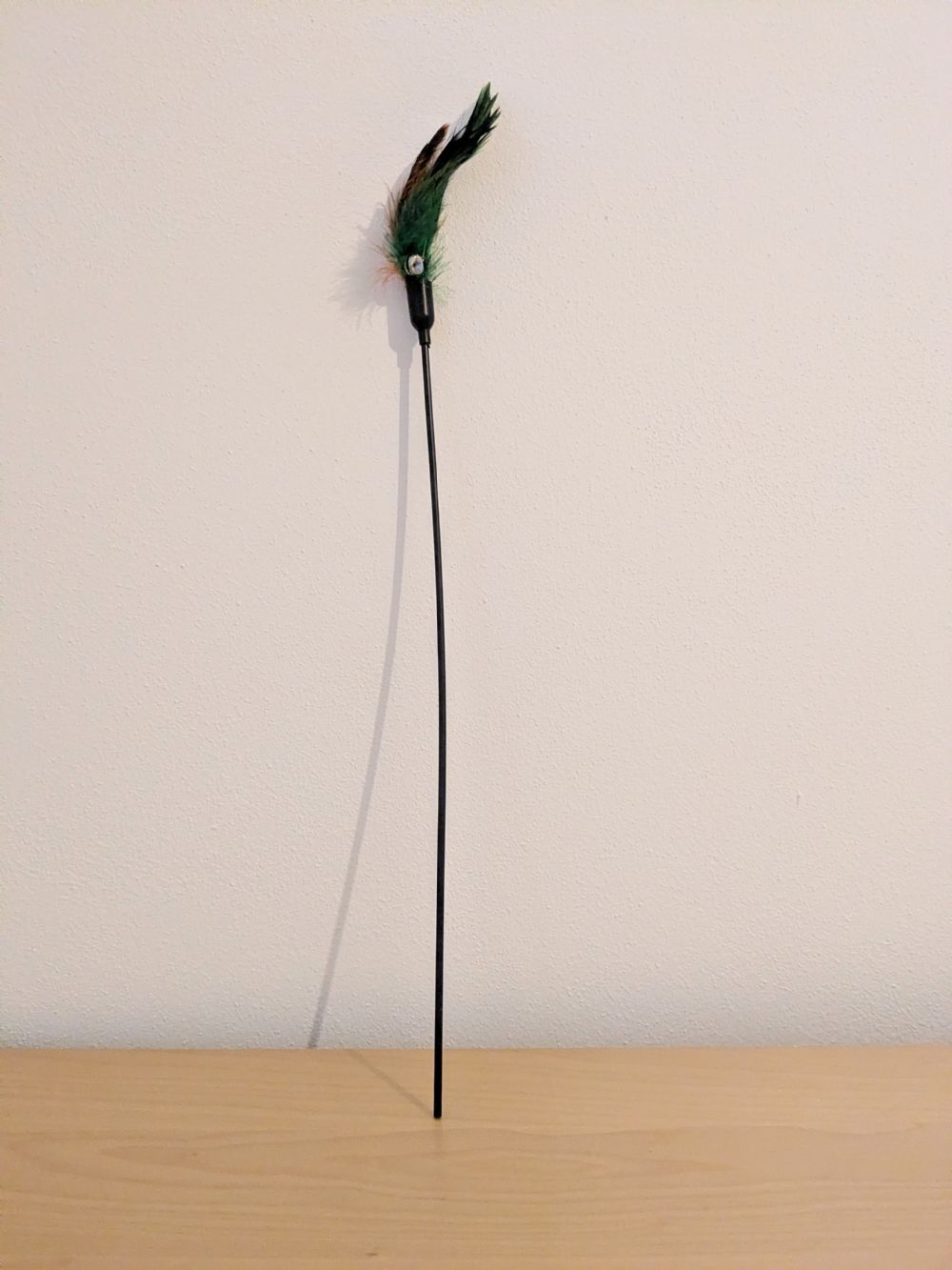 Descrizione:Bastoncino semirigido in plastica con piuma finta in plastica + campanellino all'estremità. Forse gioco per gatti . Lunghezza totale cm 51