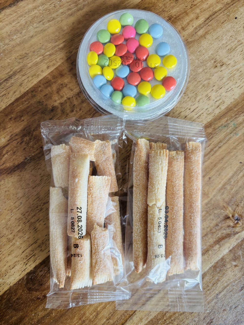 Descrizione:Due porzioni di grissini con scadenza ad agosto 2026, + 1 porzione dei miei caramelle al cioccolato