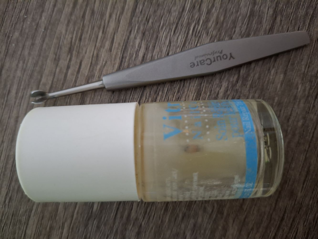 Attrezzo per manicure per tagliare le pellicine in acciaio inox e boccetto di indurente di cui è rimasto meno di metà