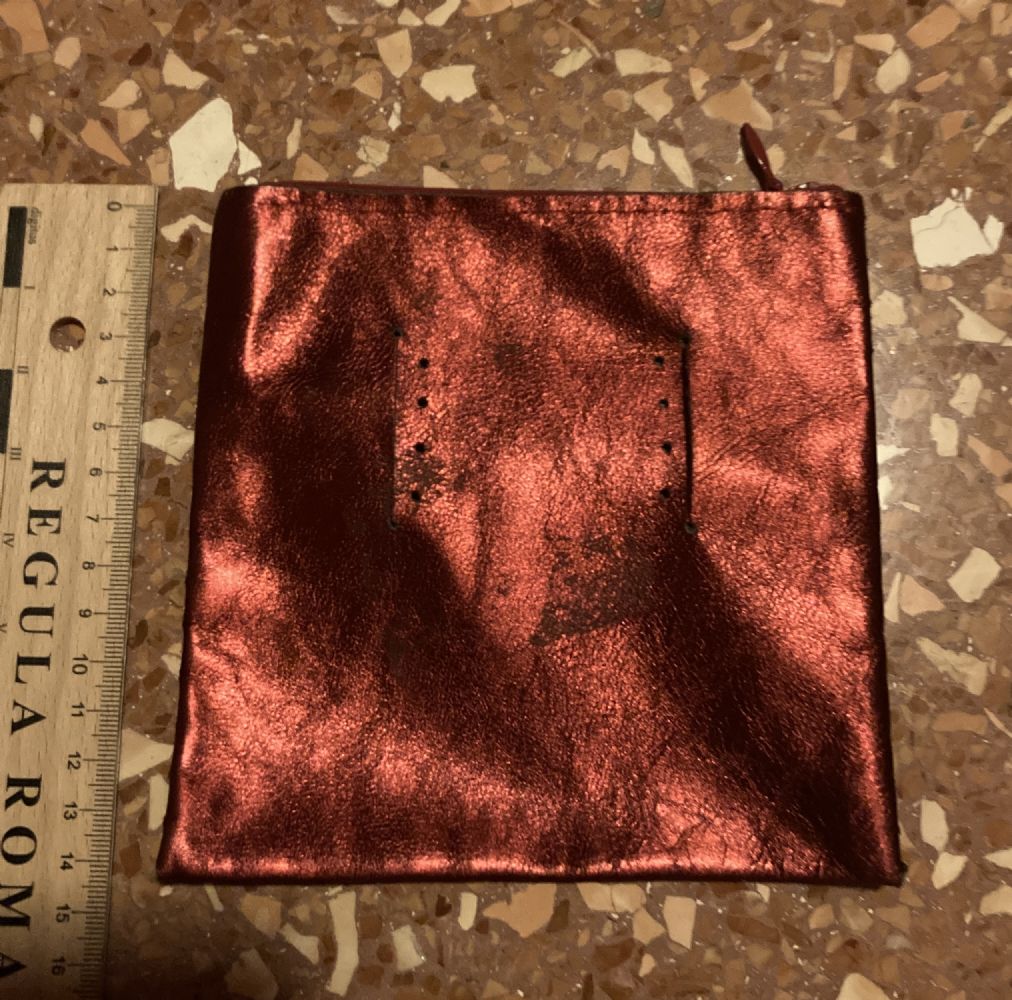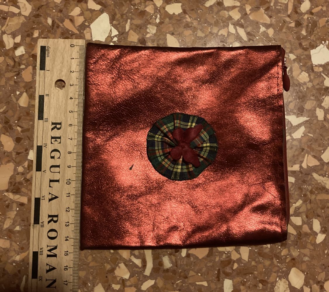 Descrizione:Dimensioni in foto, vera pelle laminata, con due fori posteriori per usarla come marsupio, chiusa con zip.