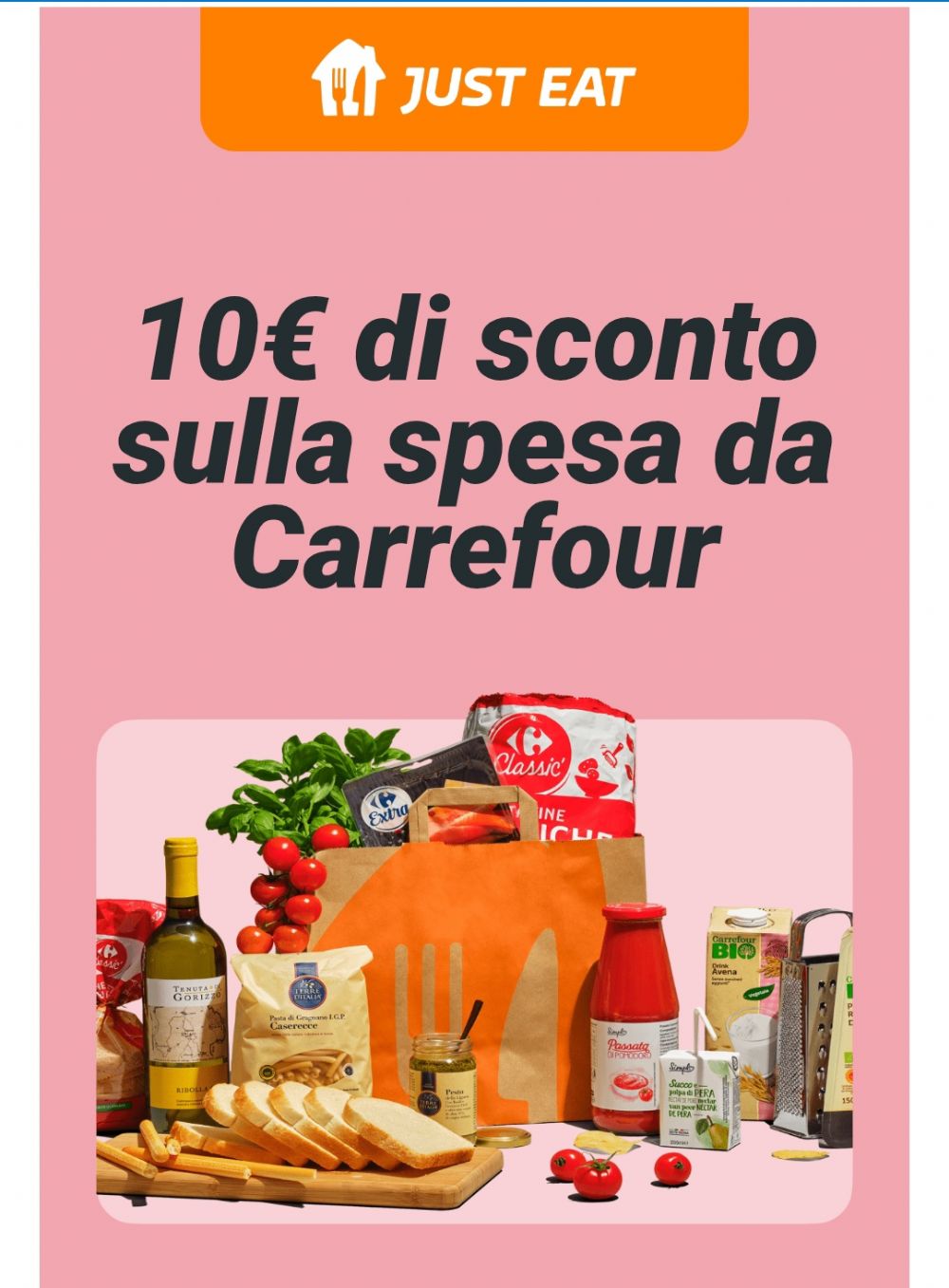 Descrizione:Buono sconto di Just eat usabile per una spesa online presso Carrefour, valore 10 euro su una spesa minima di 20 euro.