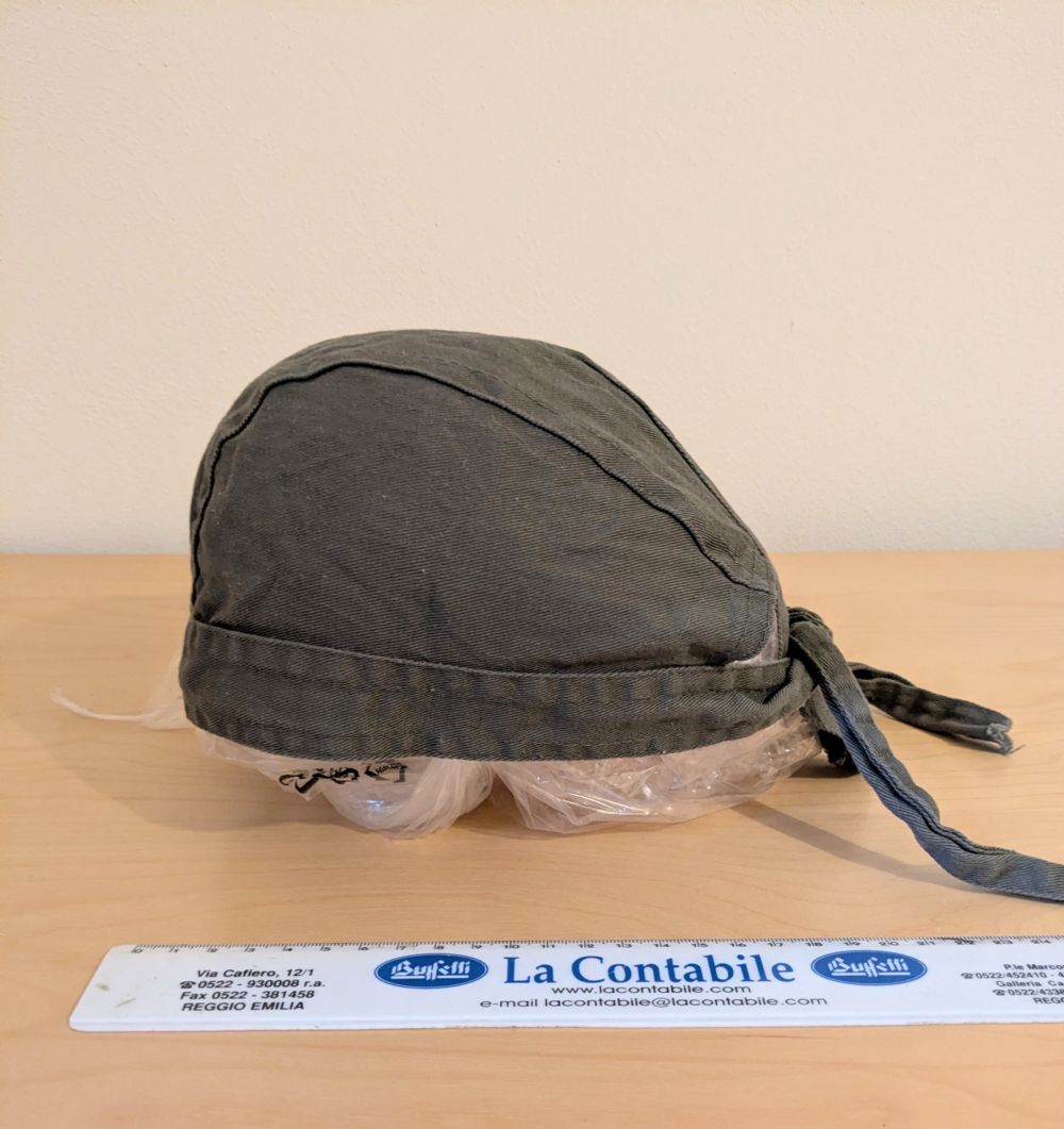 Descrizione:Cuffia di quelle che si usano per esempio in cucina realizzata in stoffa robusta tela di cotone. Ha i laccetti dietro. L'imbottitura non è inclusa, l'ho usata per far capire la forma ;)