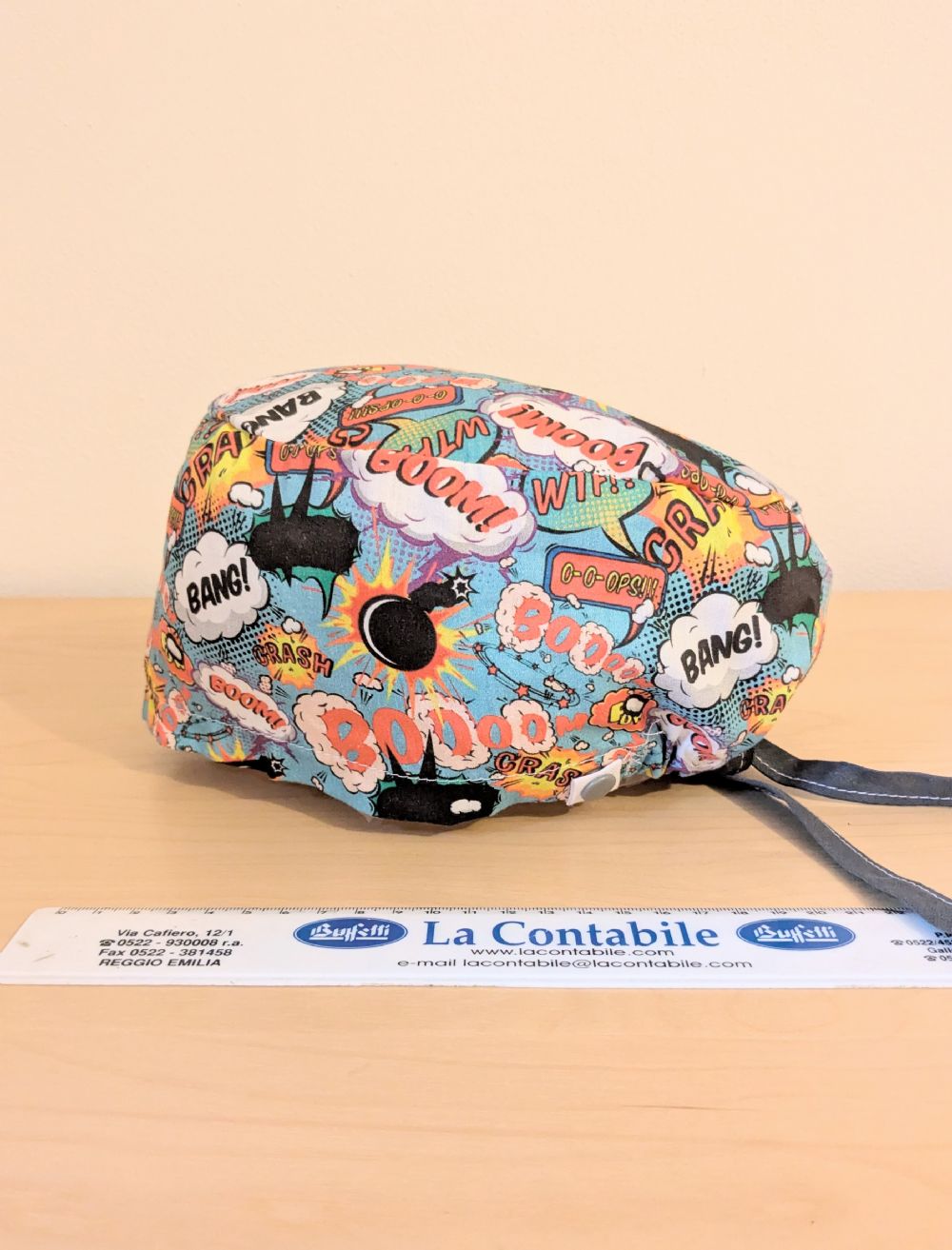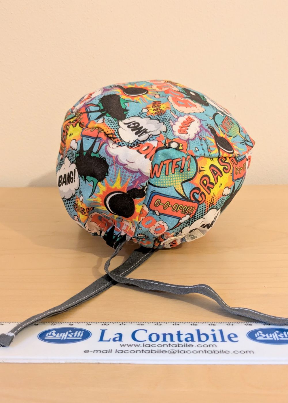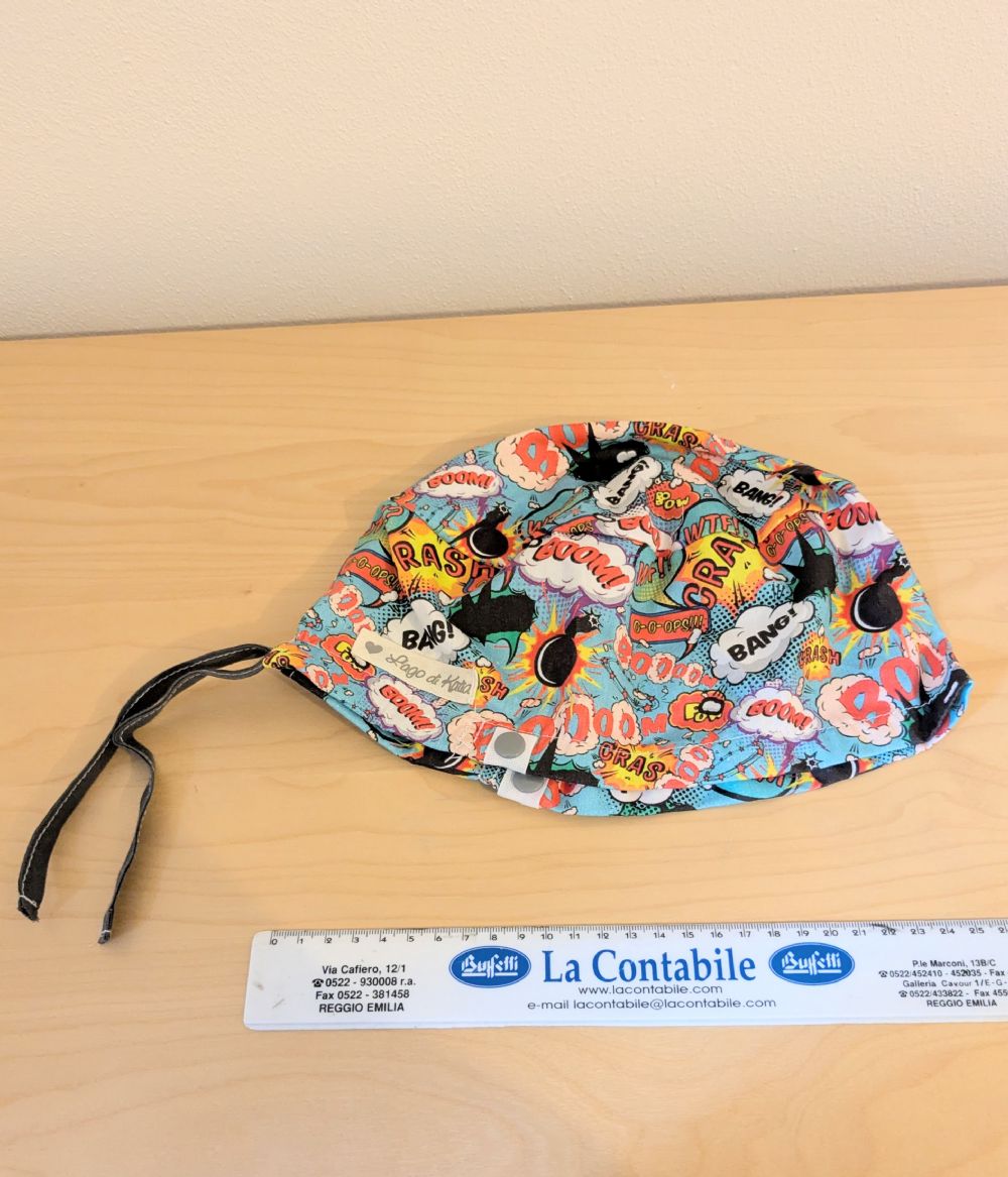 Descrizione:Cuffia di quelle che si usano per esempio in cucina realizzata in stoffa di cotone stampa cartoon. Ha due bottoncini ai lati e i laccetti sul dietro per regolarla. Circonferenza cm 60.