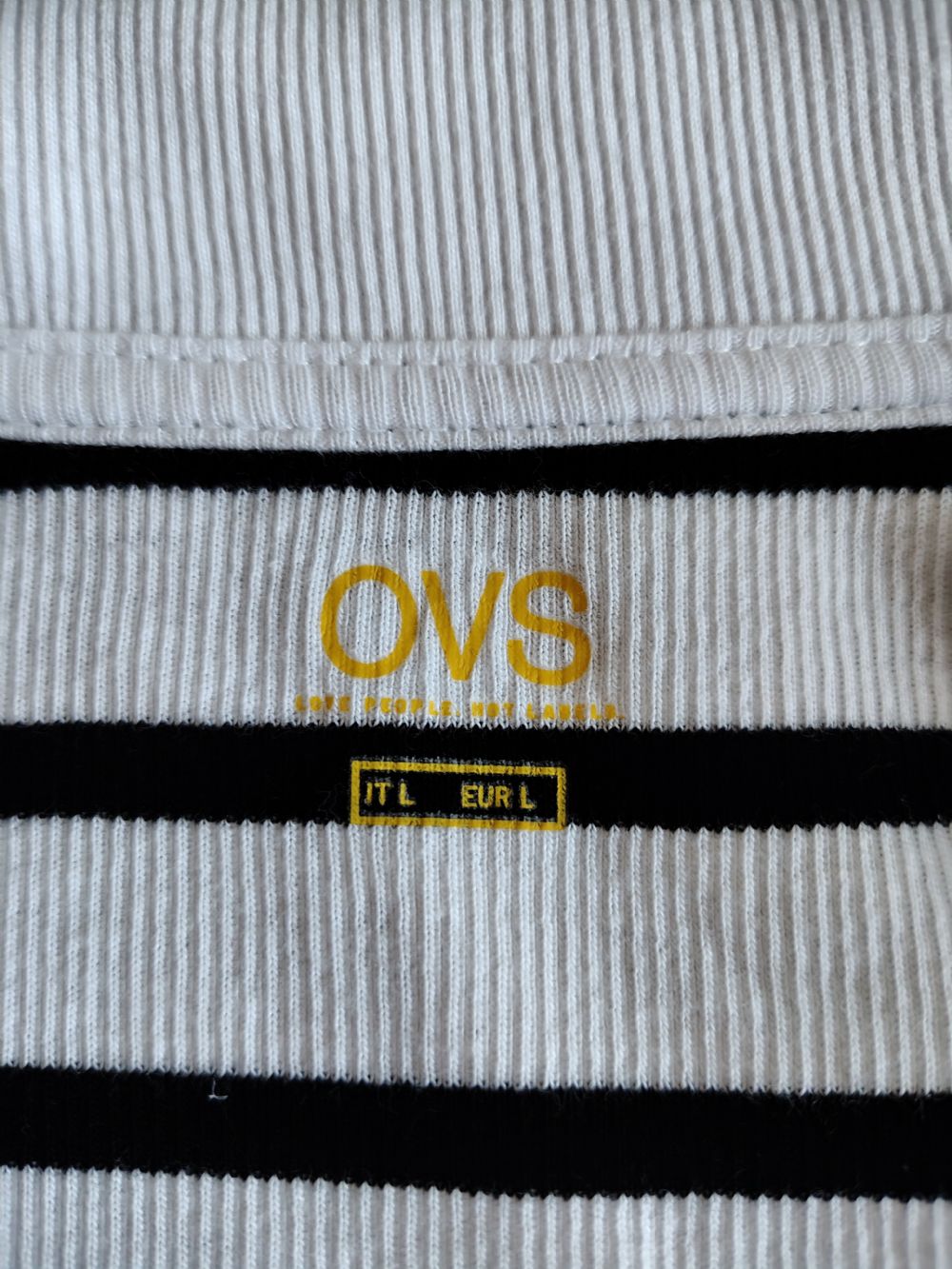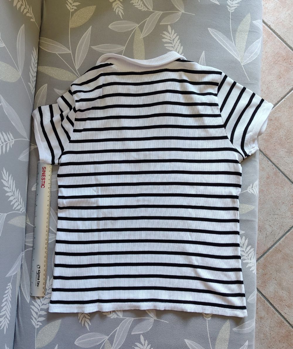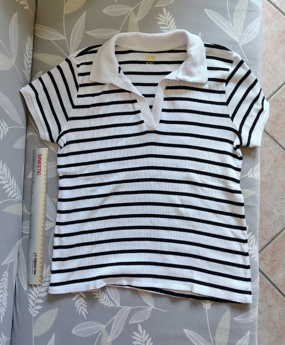 Descrizione:Maglietta maniche corte con colletto e scollo a V in cotone marca OVS. Taglia 46. Bianco nero.