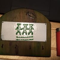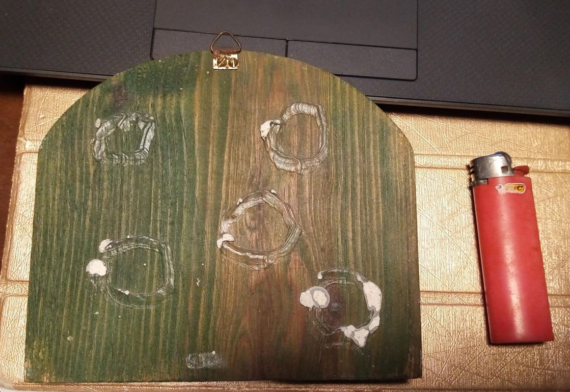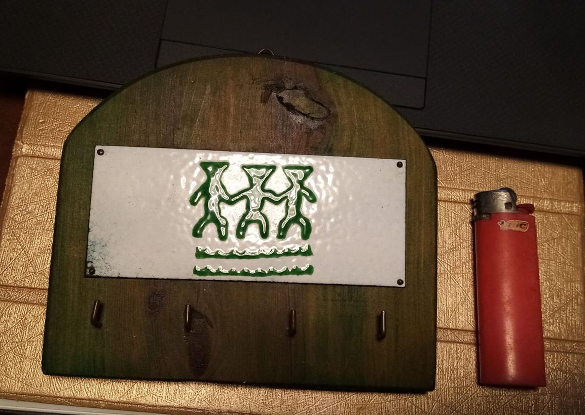In legno con 4 ganci, la piastra sembra metallo smaltato, sul retro c'è il gancio per appenderla al muro e delle tracce di colla come se fosse stato attaccato con quella invece che con un chiodo.