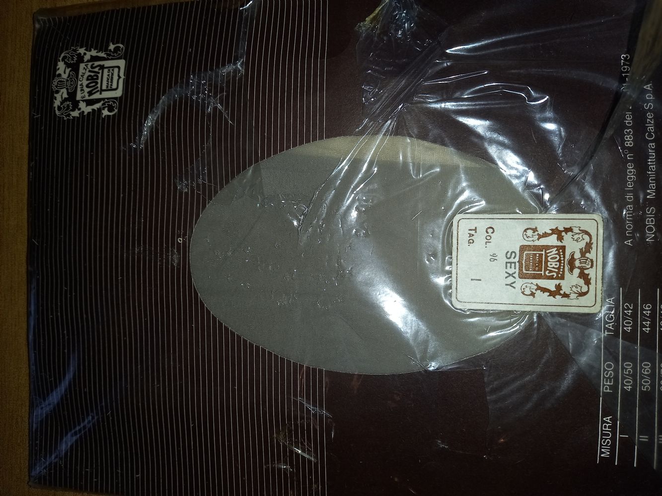 In poliammide 100%, made in Italy, si è rotto un pezzo di cellophane,ma le calze sono integre, colore come si vede al centro della busta