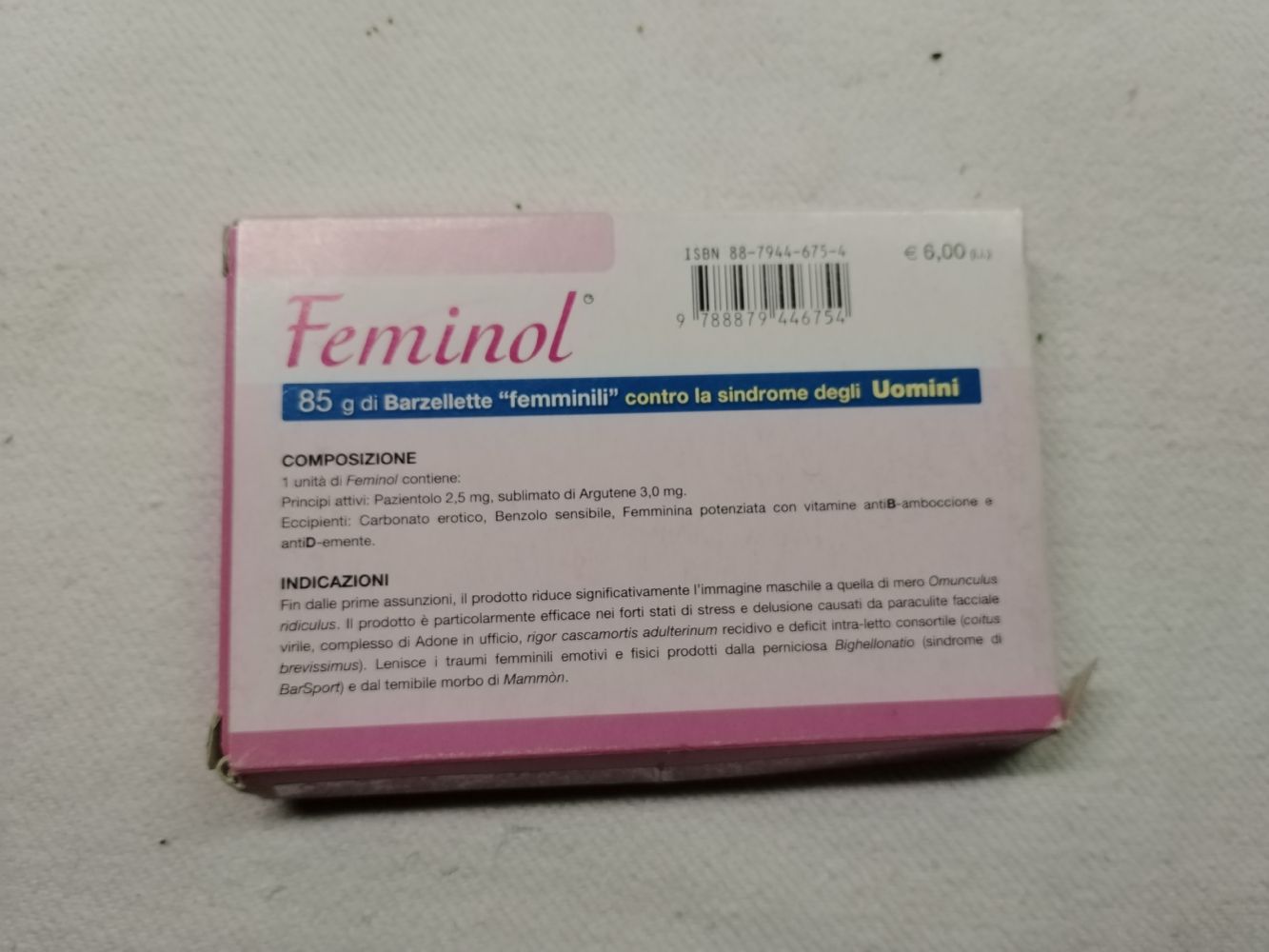 FEMINOL 85 grammi di barzellette femminili contro la sindrome degli uomini Una facciata della scatola e'' rovinata