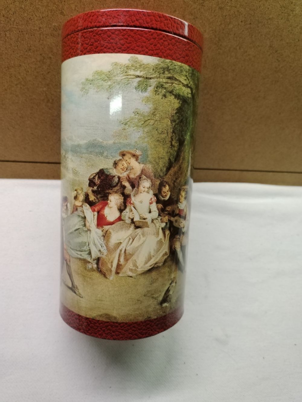 Scatola rotonda in metallo di colore rosso con disegni dell' epoca