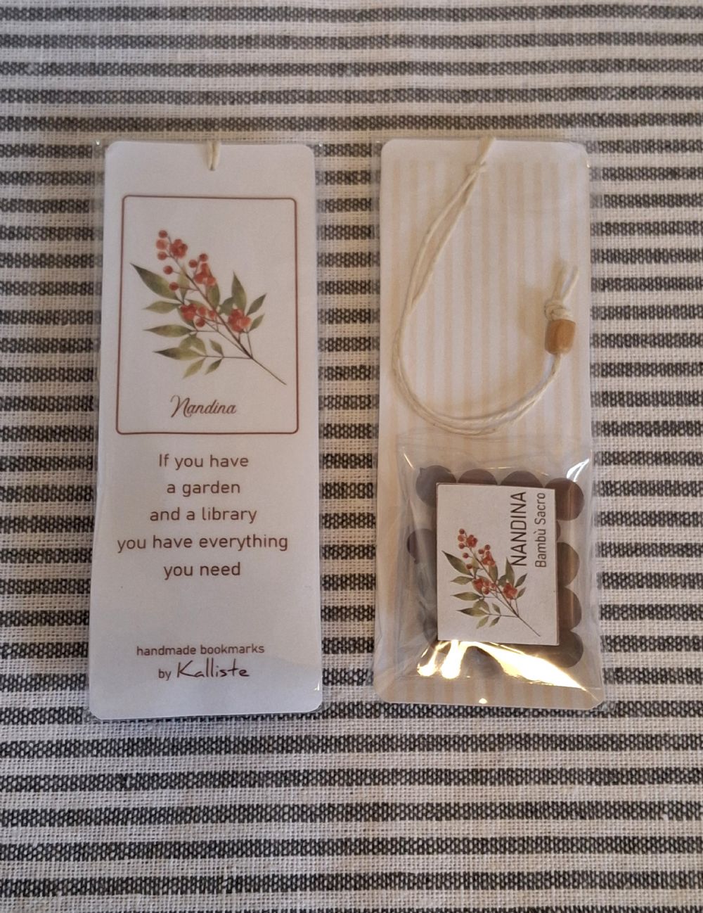 Descrizione:Segnalibro in cartoncino plastificato e semi di Nandina detta anche bambù sacro.