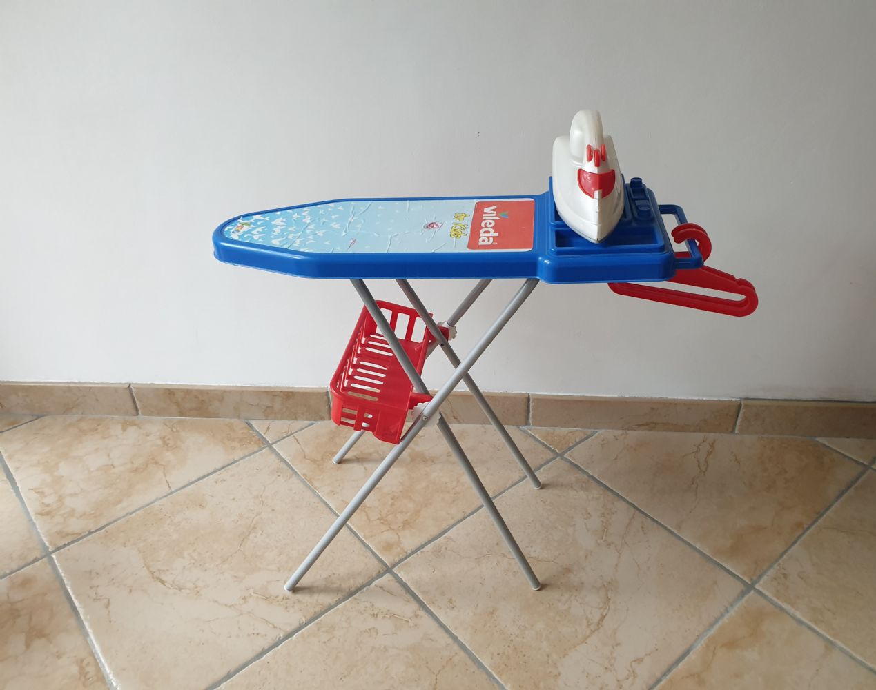 Descrizione:Asse da stiro Vileda, giocattolo, con ferro da stiro, cestino e 2 stampelle appendiabiti.