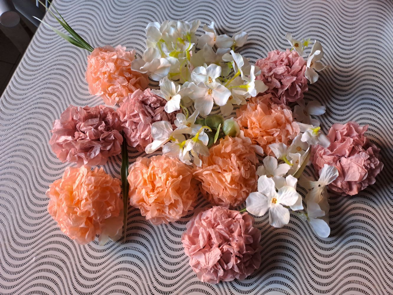 Descrizione:Gruppo decorazioni ponpon in carta velina, con fiori e foglie, usati per una occasione.ogni ponpon ha un diametro di circa 10 cm