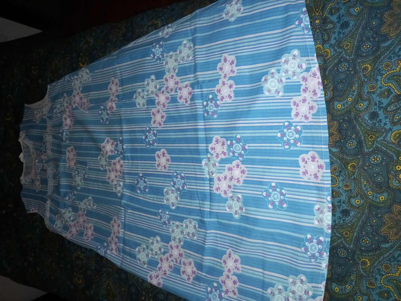 In cotone, estiva, di buona qualità. Larghezza spalle cm 37, torace cm47,lunghezza camicia circa 96 cm