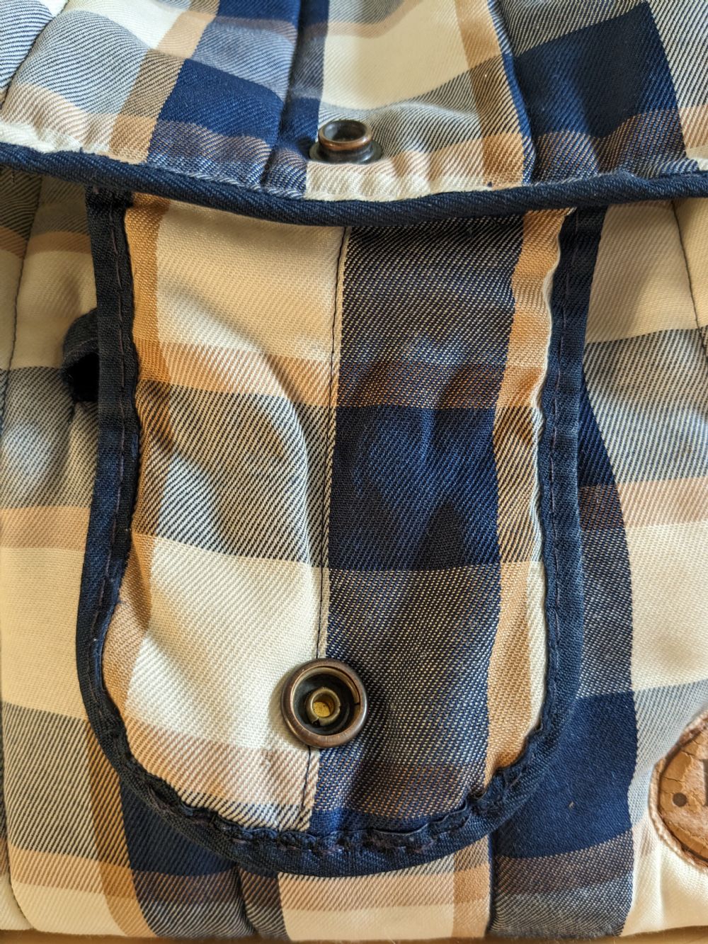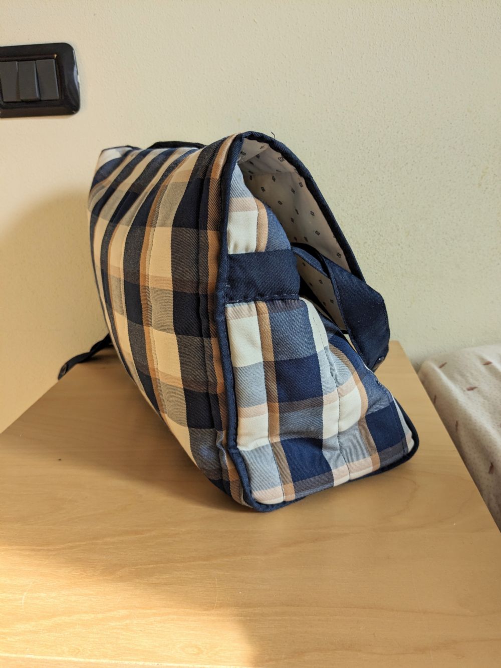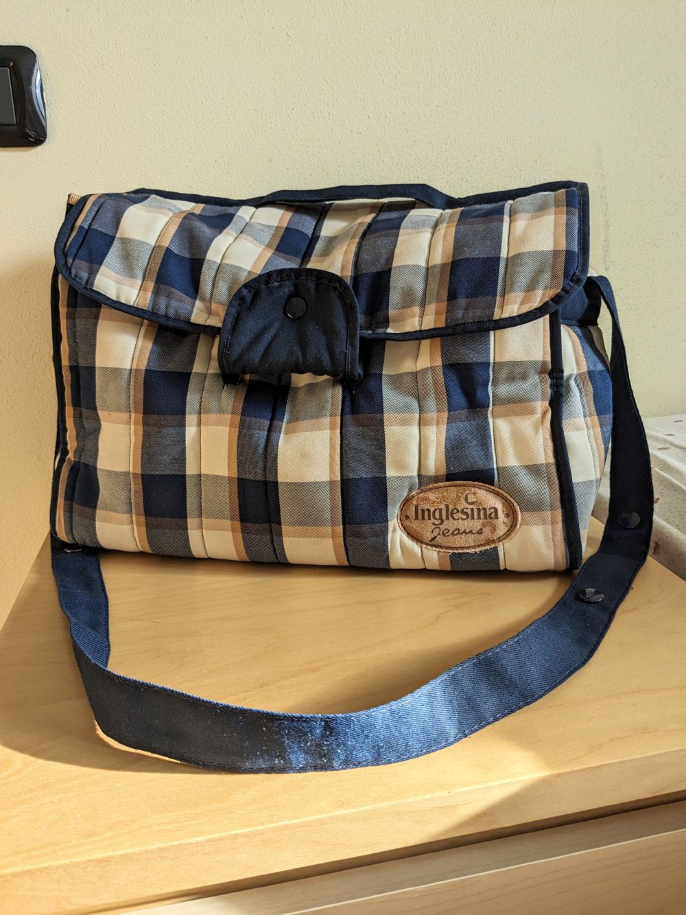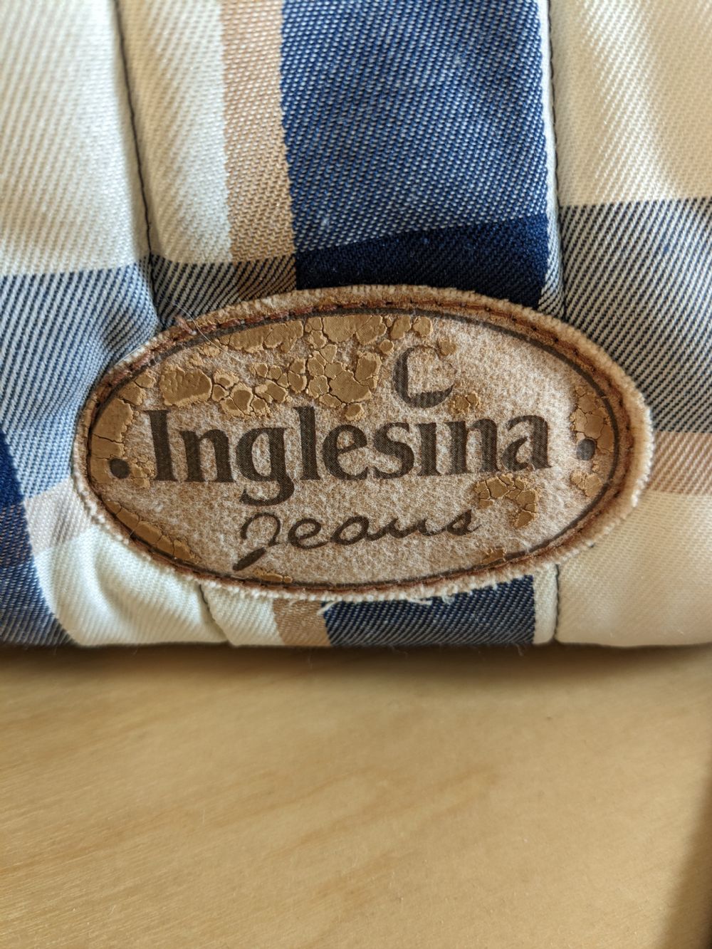 Descrizione:Borsa Inglesina Jeans, molto capiente. Unici difettucci (fotografati) sulla toppa col logo e sulla chiusura principale (è stata rammendata). La tracolla è regolabile mediante i bottoni a pressione. Molto robusta Dimensioni: larghezza cm 36, profondità cm 13, altezza cm 26