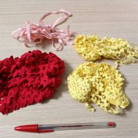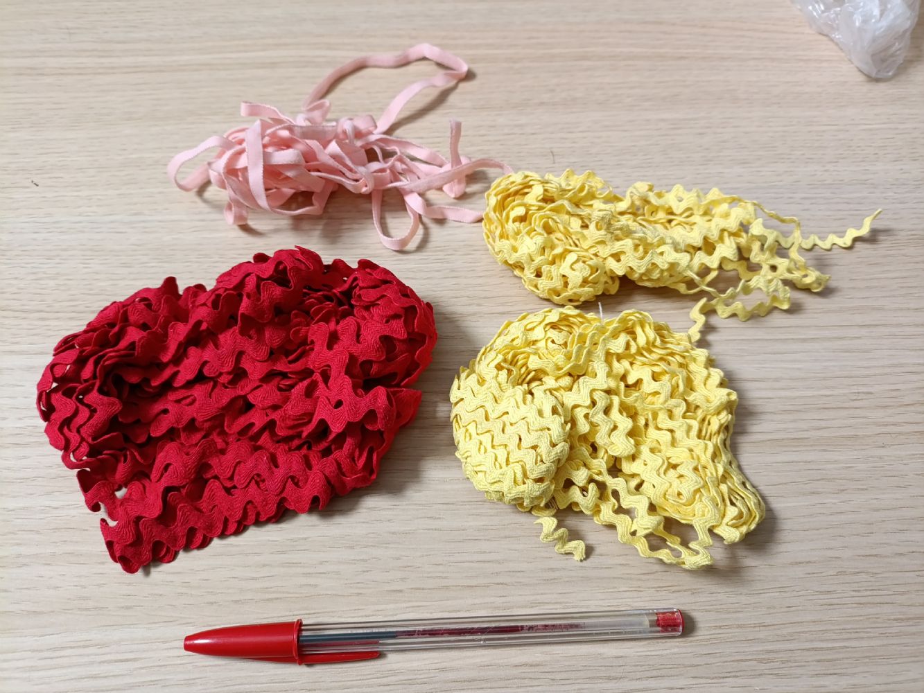 Descrizione:Nastro stoffa colorato: rosso, giallo (tipo fettuccia ondulata) e rosa (di velluto). Non so la lunghezza ma ce n'è un bel po'