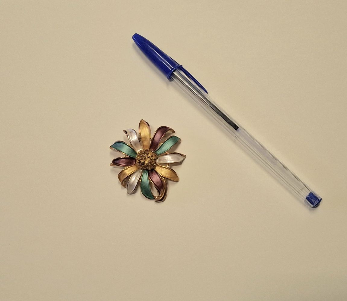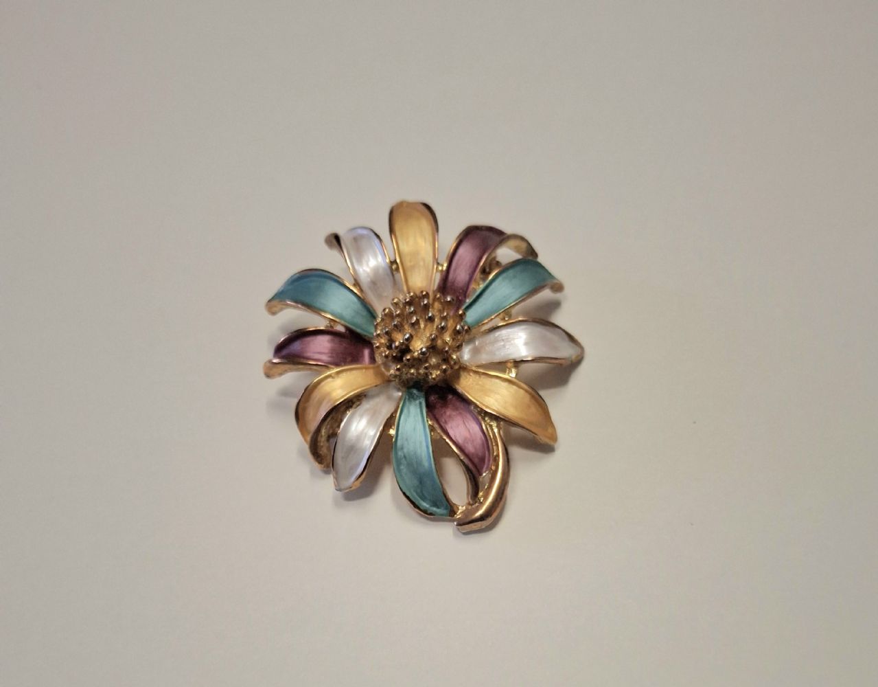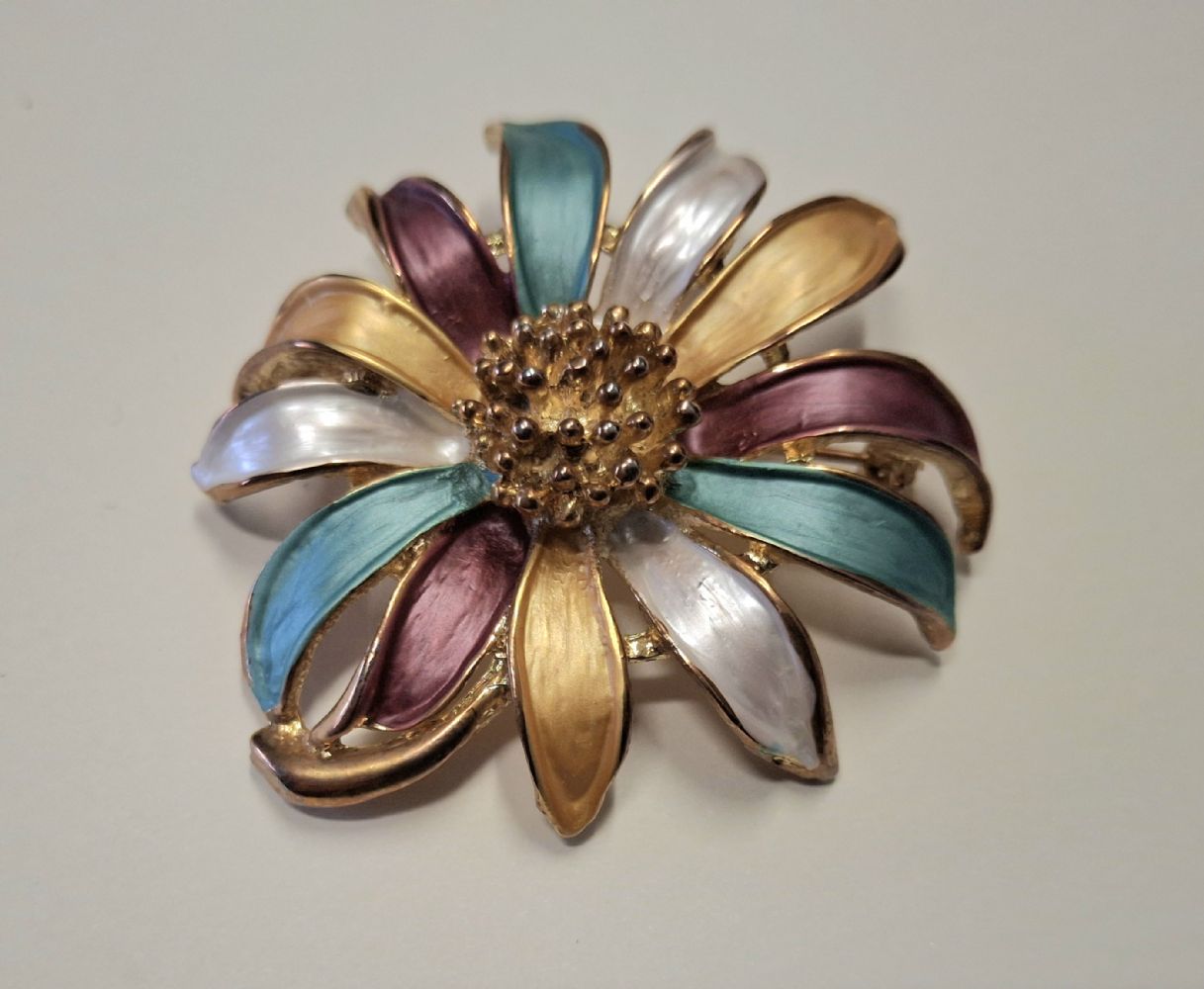 Descrizione:Spilla di grandi dimensioni a forma di fiore con petali laccati., come si vede dalle foto dettaglio è in ottime condizioni.