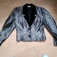 Descrizione:Giacca in tessuto sintetico (acetato) cangiante con bavero in velluto. Leggermente sciancrata con maniche a sbuffo e bottoni gioiello