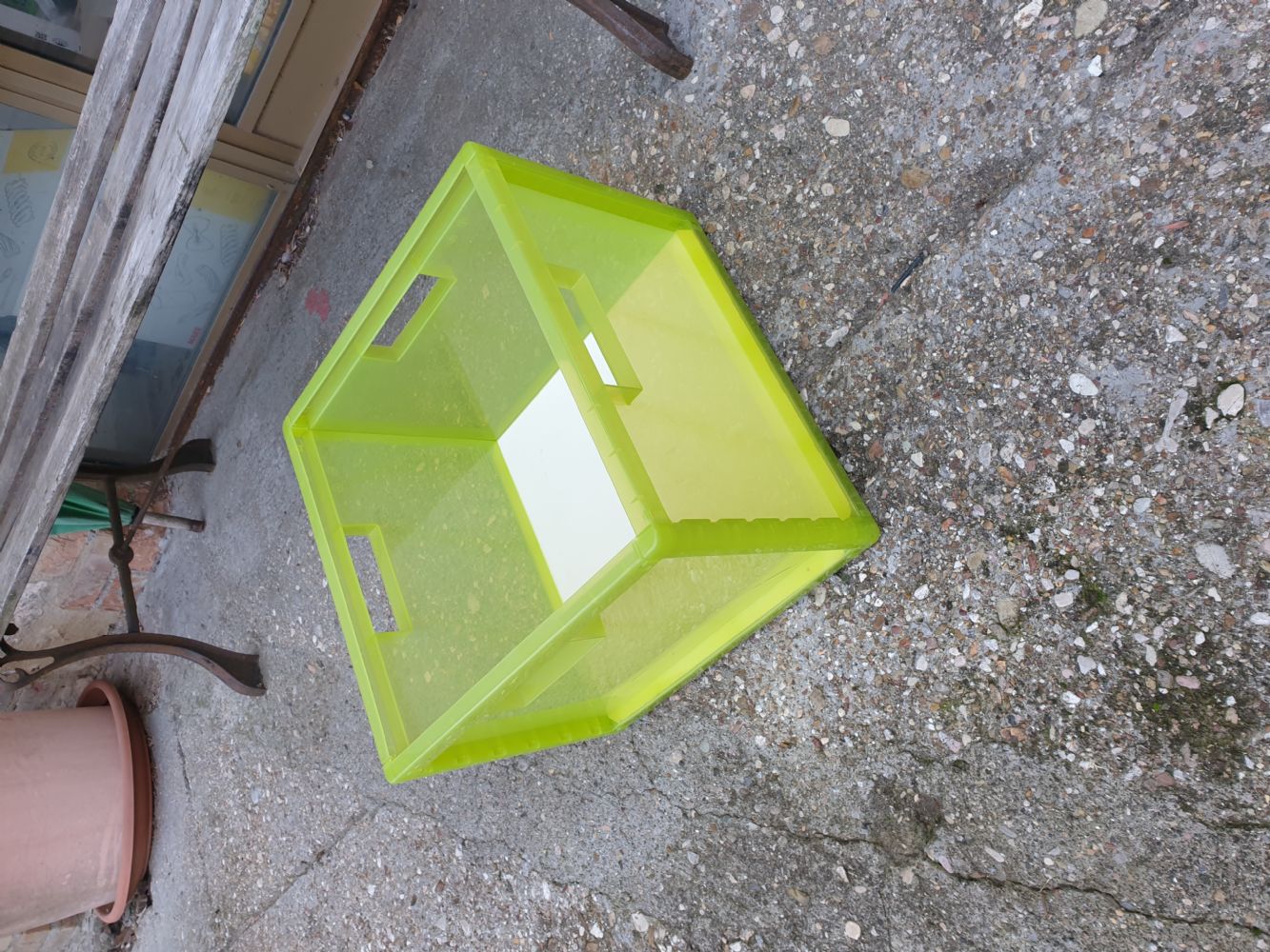 Descrizione:Contenitore cubo con maniglie, in plastica resistente. Il fondo è in legno compensato.