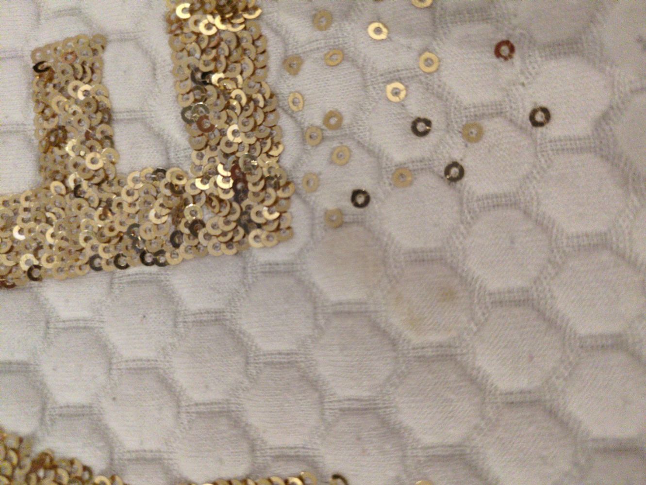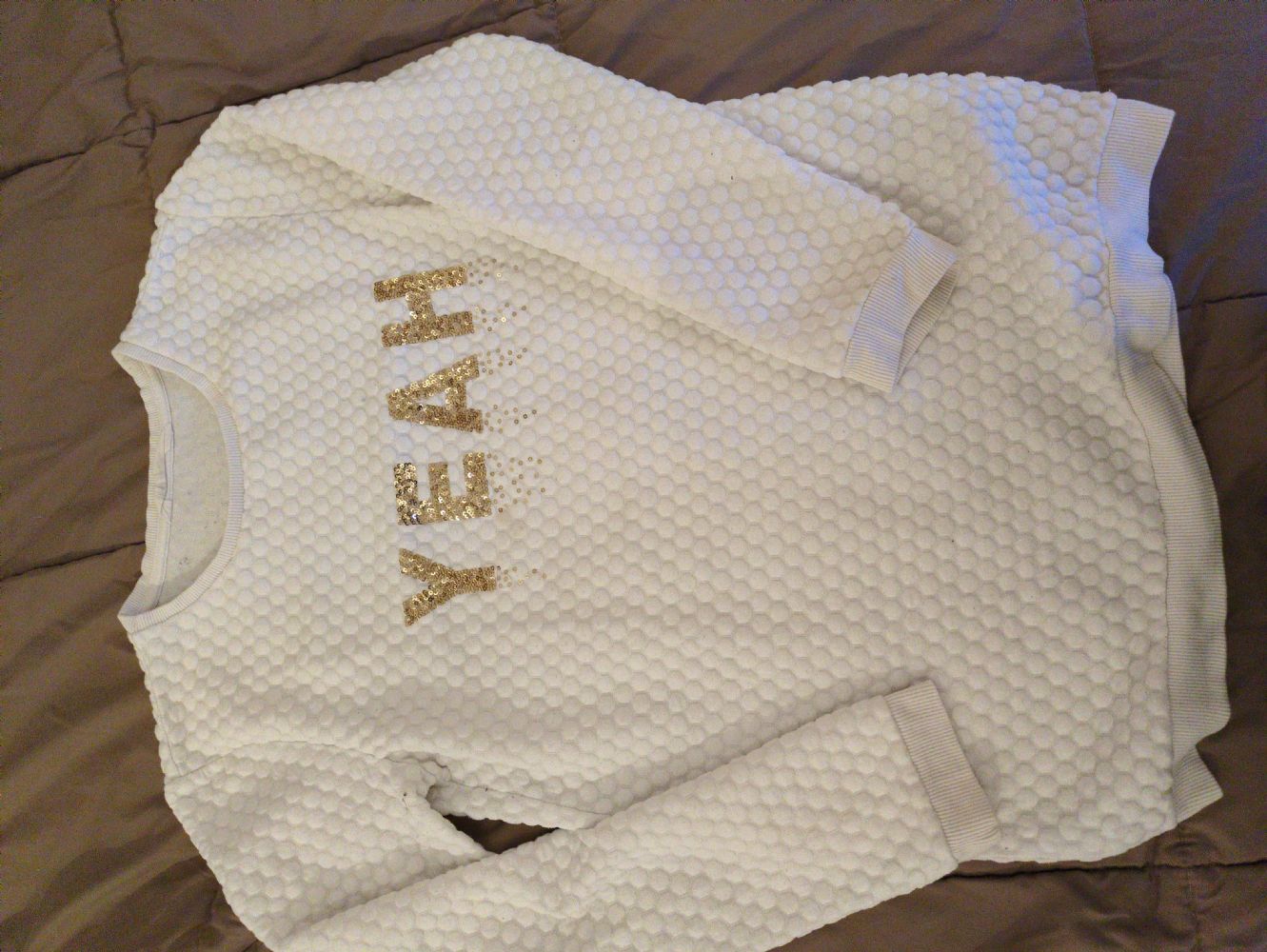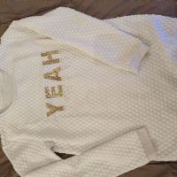 Maglioncino cotone tg M scritta dorata con paillettes, colore bianco. Piccole macchiette gialle sotto la lettera E come si vede in foto, per il resto è un ottime condizioni.