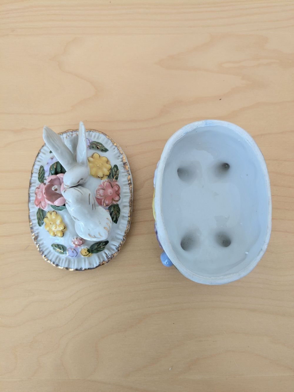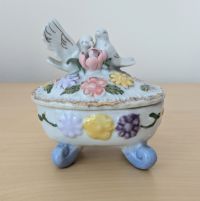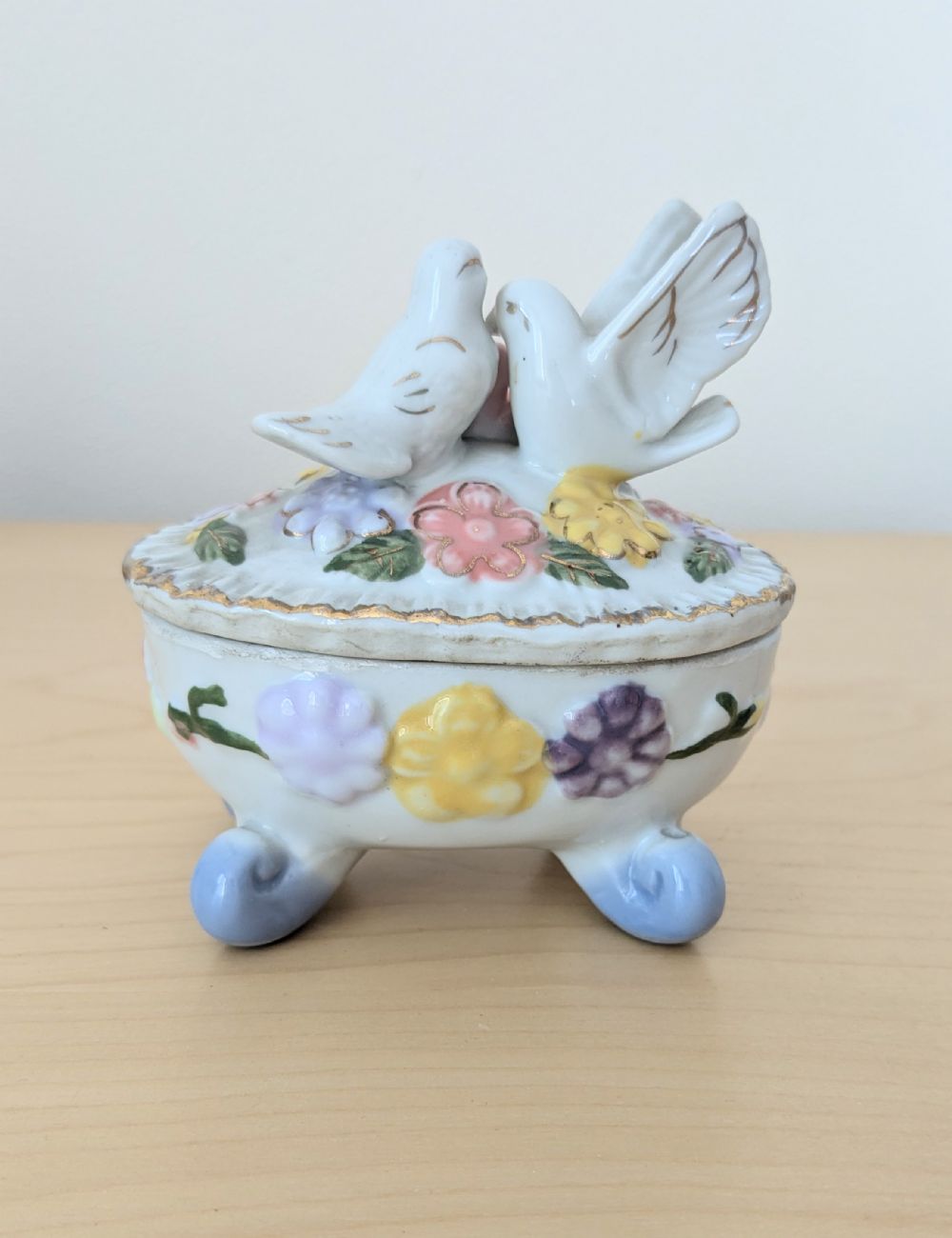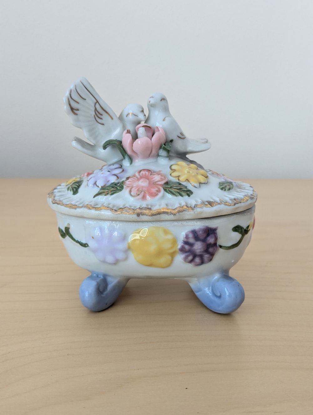 Descrizione:Portagioie in porcellana con due colombe. Altezza totale cm 11