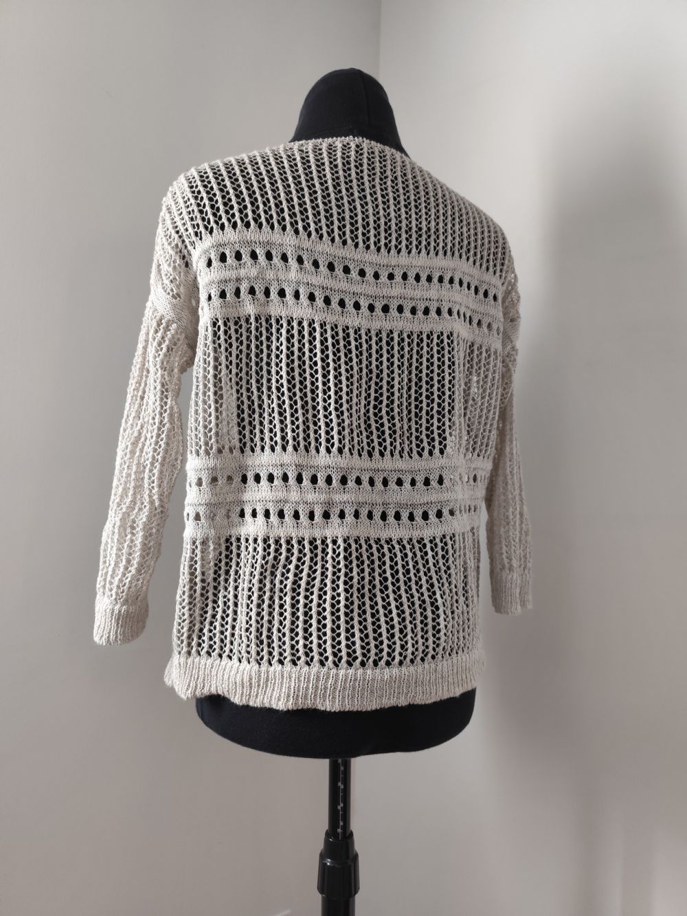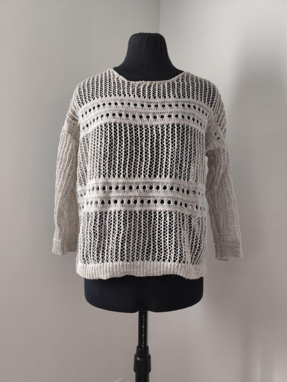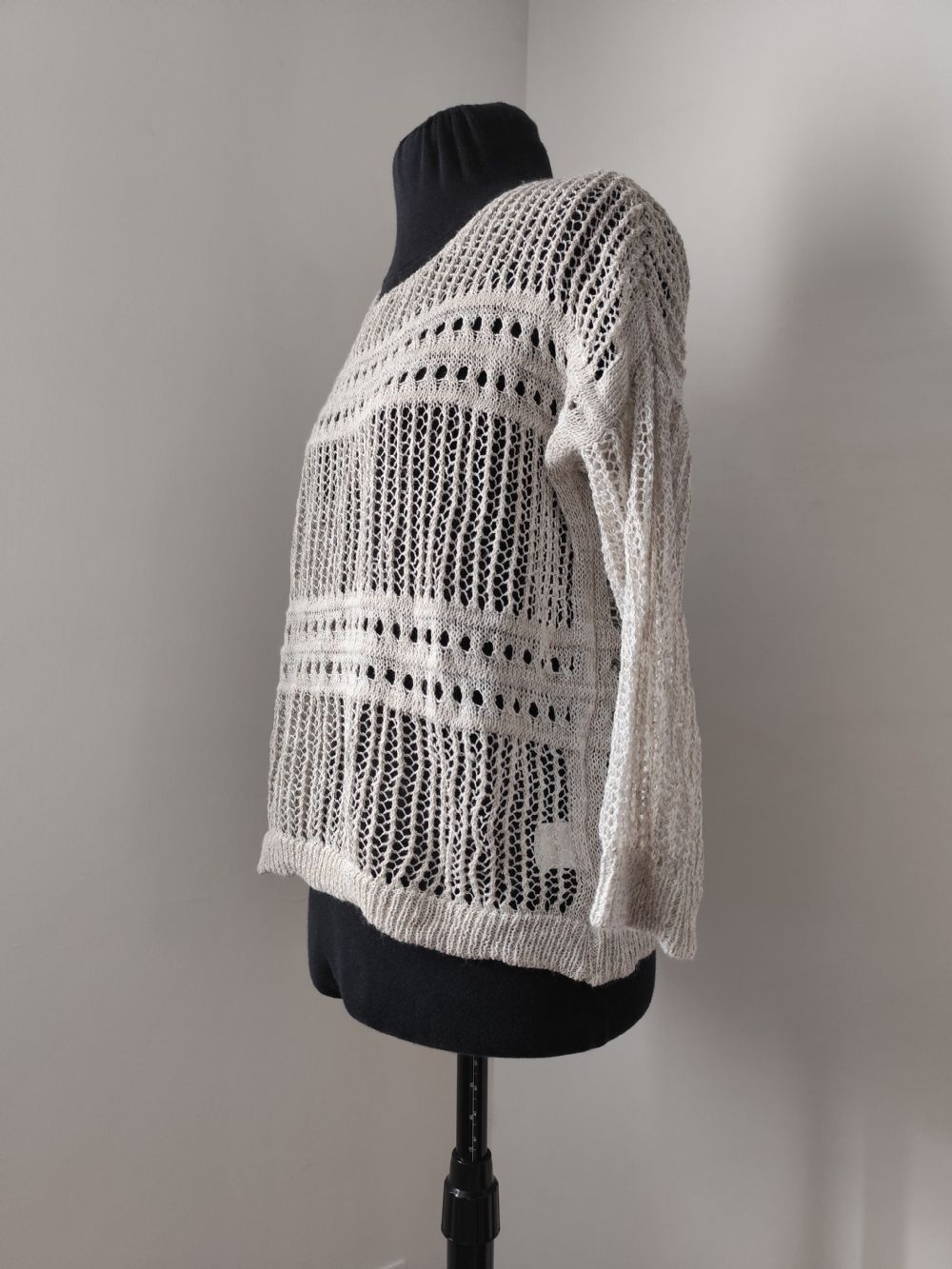 Descrizione:Maglia traforata color panna con filo in lurex nella lavorazione. Modello semplice con manica a tre quarti, si adatta bene a diverse fisicità essendo molto morbido ed elastico. Lavorazione a maglia, in ottime condizioni.