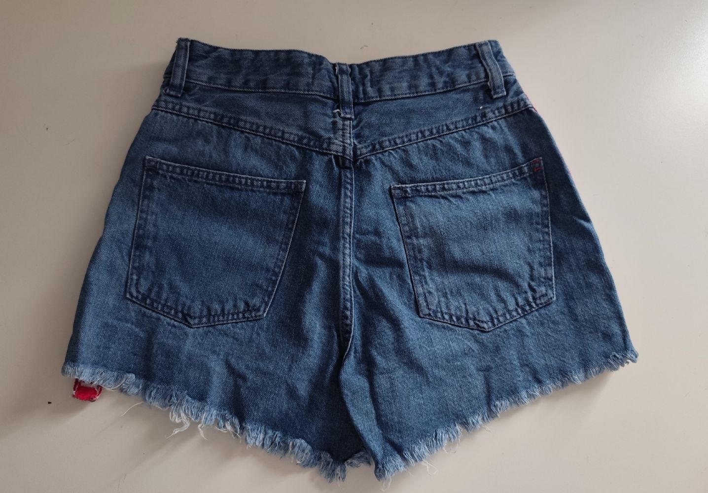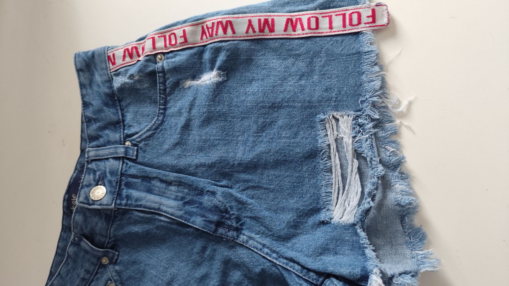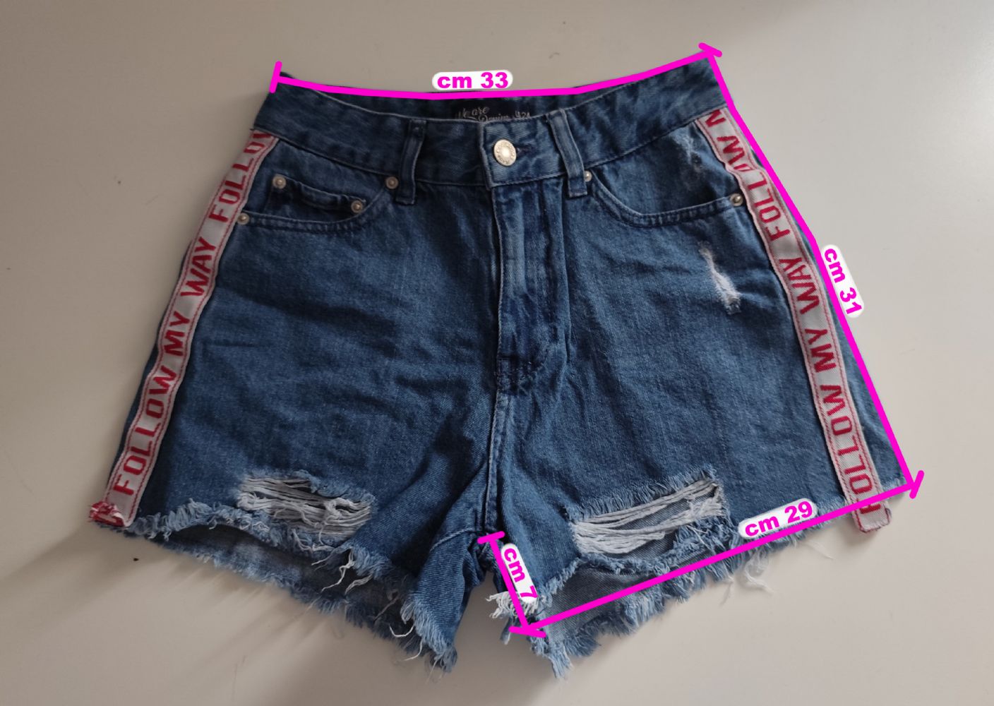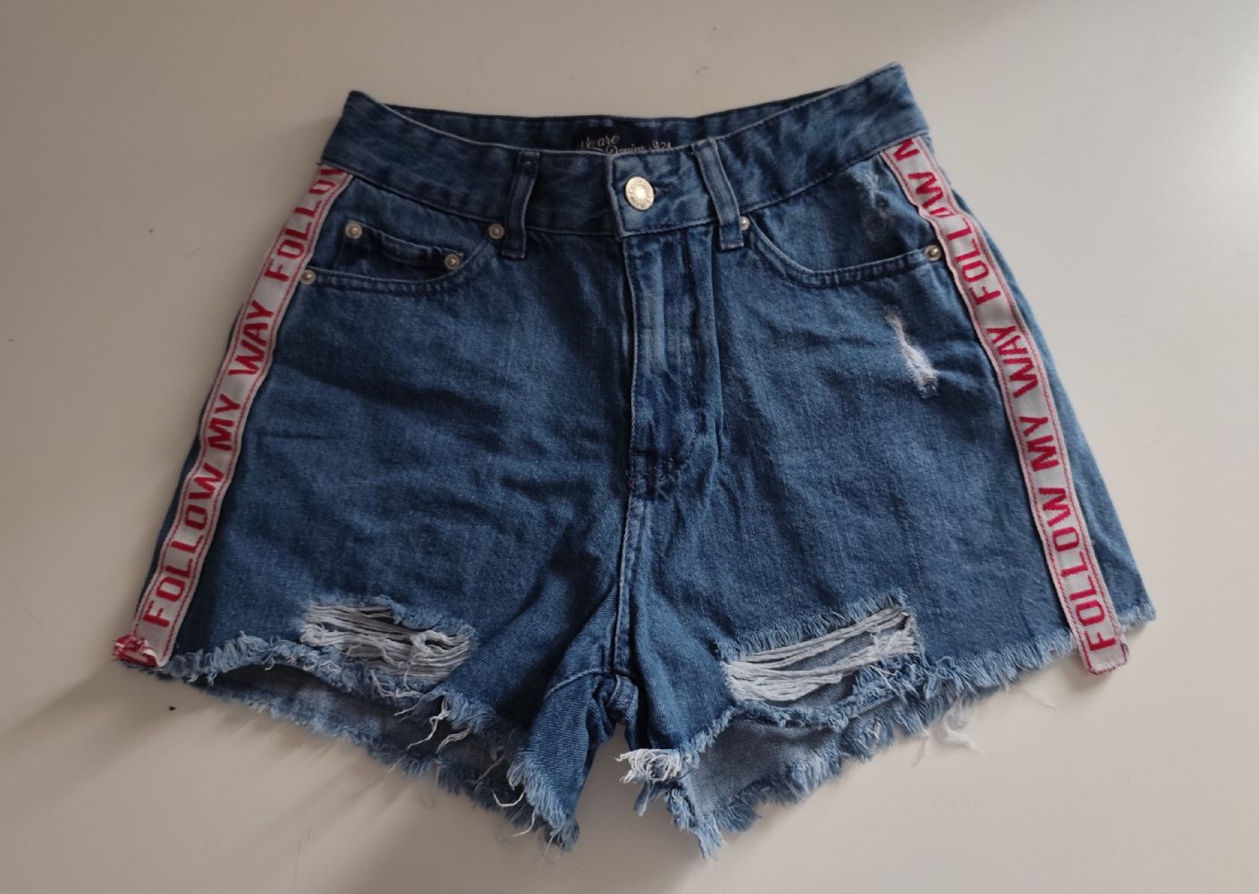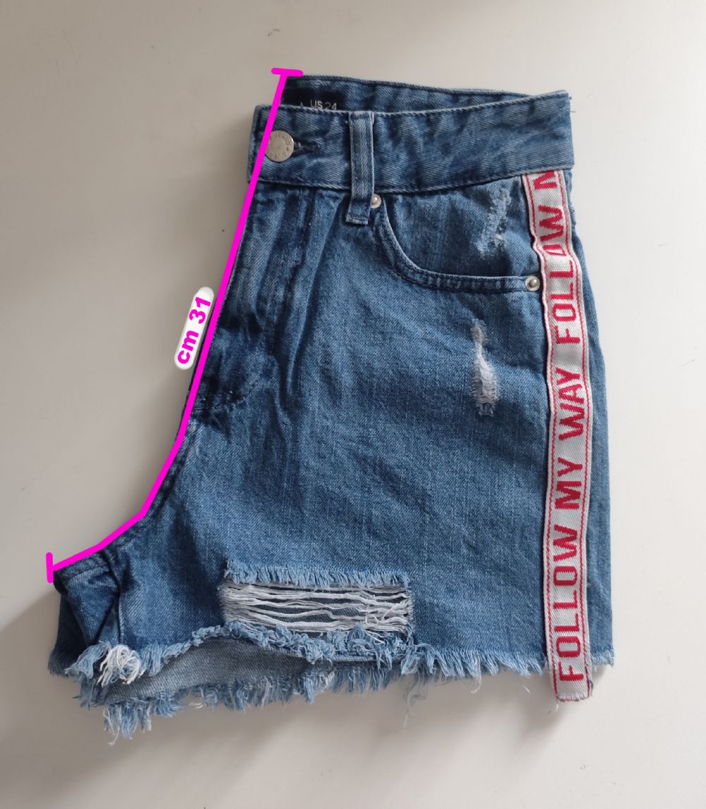 Descrizione:Pantaloncino in jeans Jennyfer, modello a vita alta con bordi a taglio vivo, sfilacciati, strappi e abrasioni sulla coscia; ha 5 tasche e due fasce laterali applicate con la scritta “Follow me way". In ottime condizioni, come da foto.