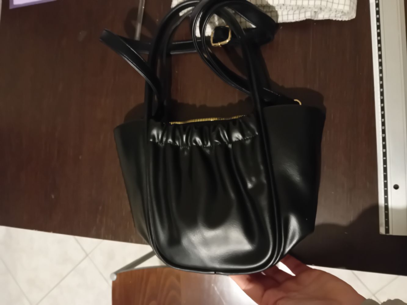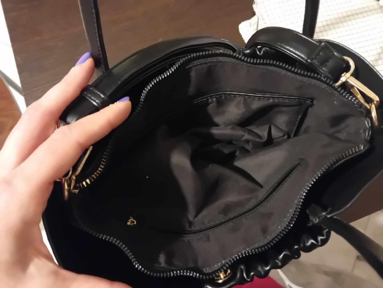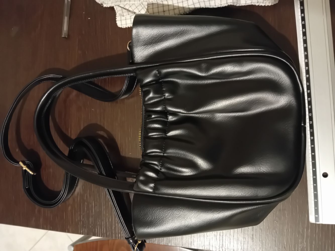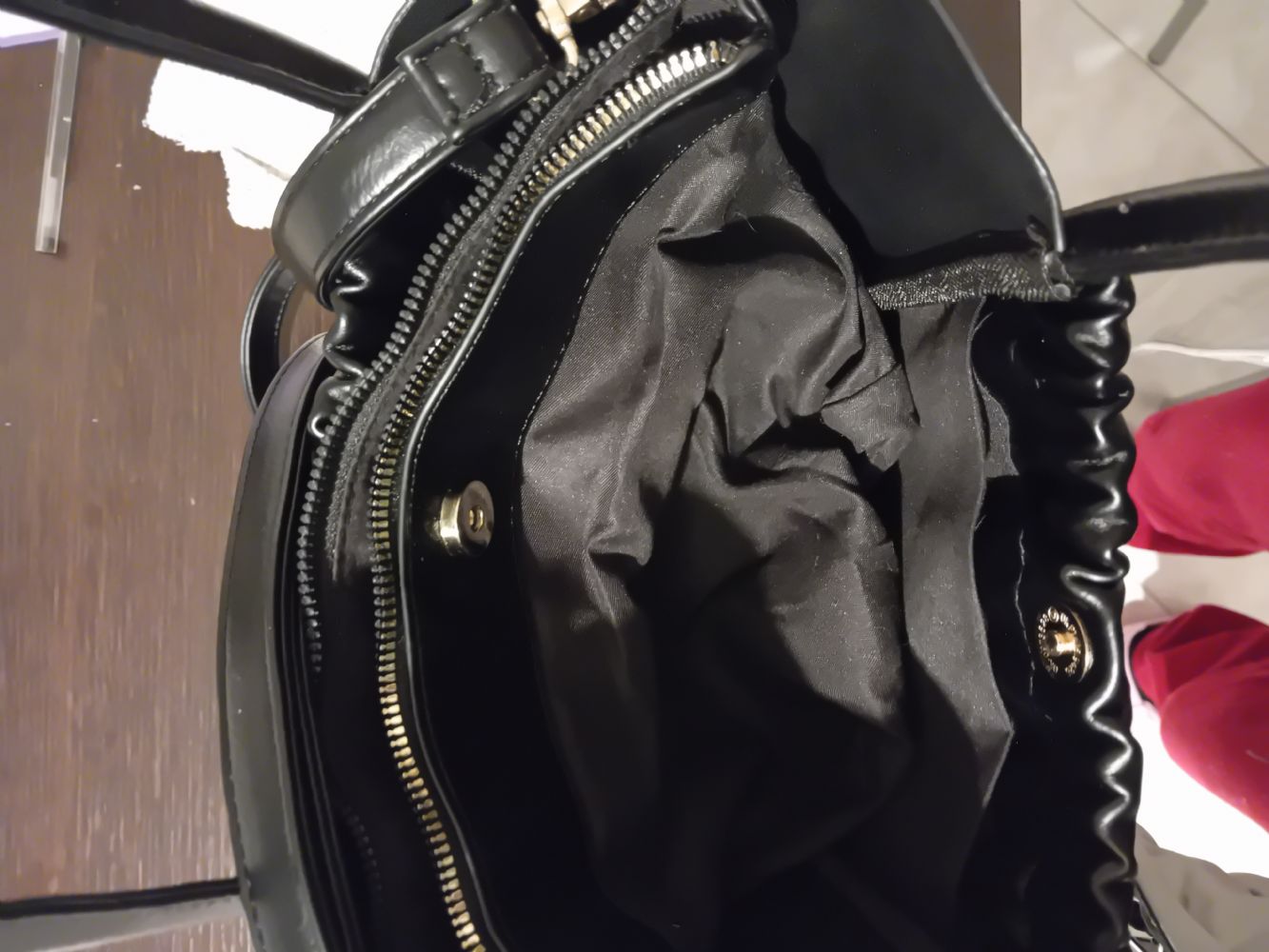Credo nuova ma non c è etichetta con 3 conparti e taschine non c è etichetta presumo ecopelle comunque fatta bene si manici che tracolla , al centro si chiude con cerniera nei lati da bottoni