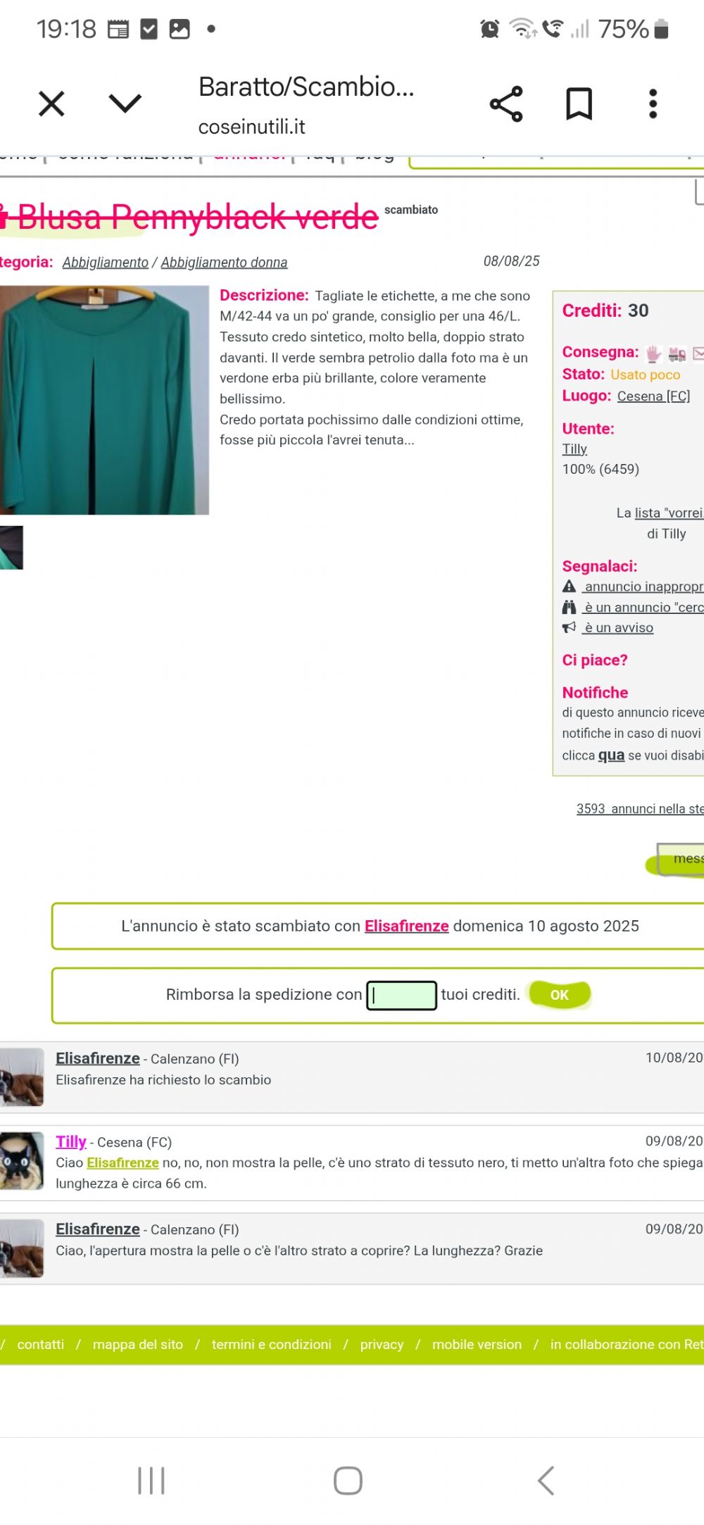Descrizione:Blusa Pennyblack verde. Presa qui a 30 crediti ma l'ho lavata prima di indossarla e si è scucita davanti. Se qualcuno è in grado di ripararla, io la cedo a 1 credito. Nell'ultima foto trovate l'annuncio originale coi dettagli. Spedisco in collettiva spero prima di Natale