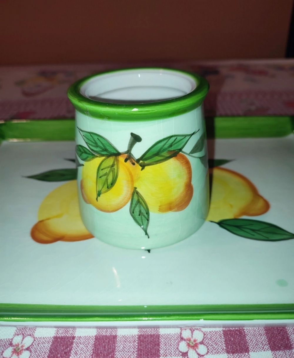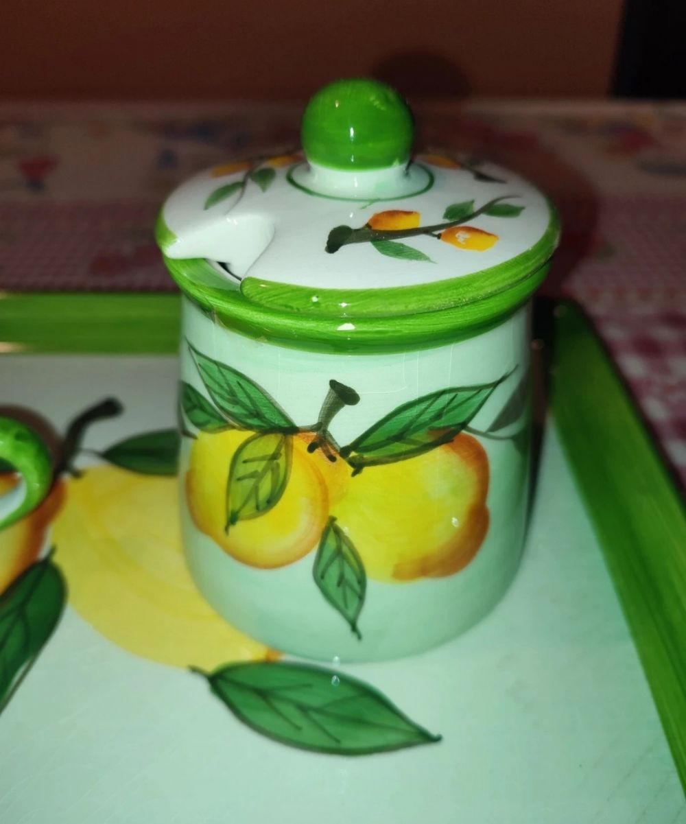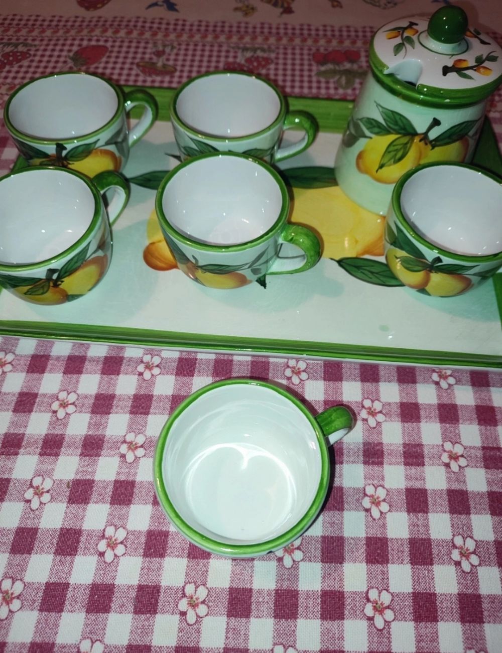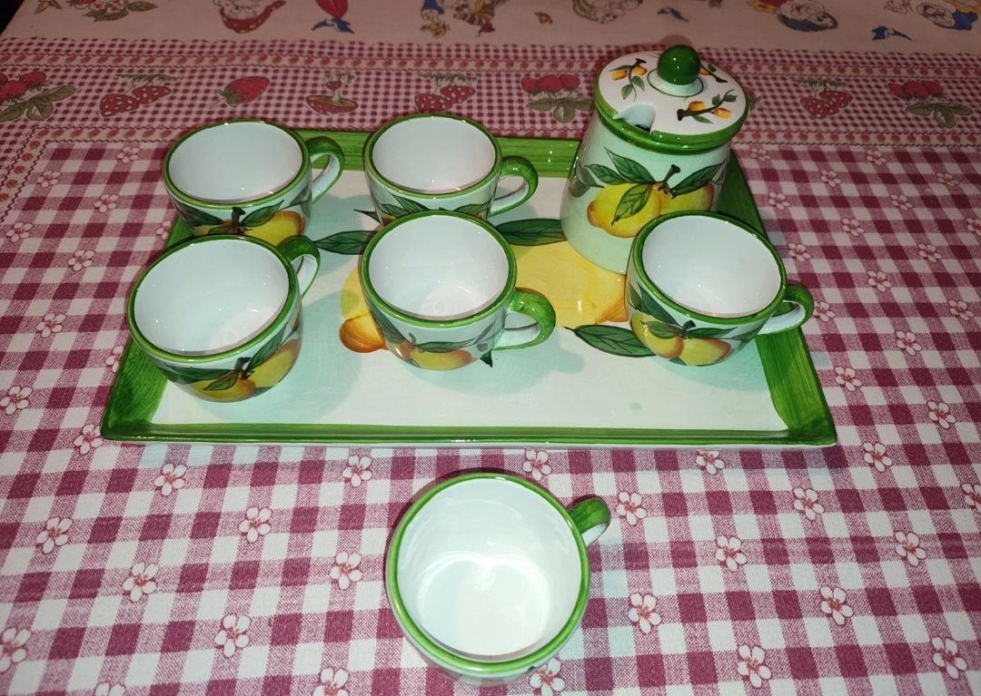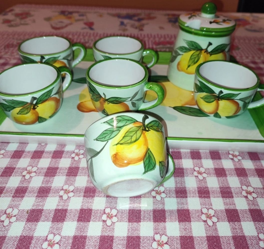 Descrizione:Elegante servizio da caffè con decorazione di limoni. Include 6 tazzine, zuccheriera e vassoio (cm 30x20)
