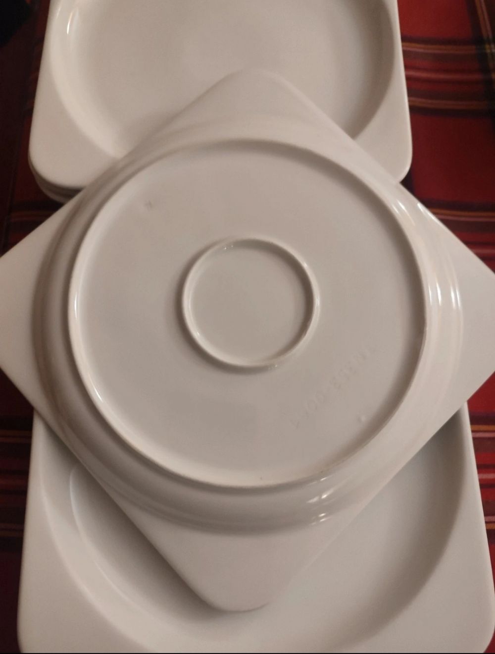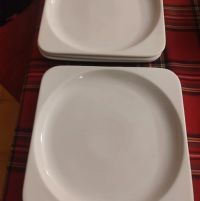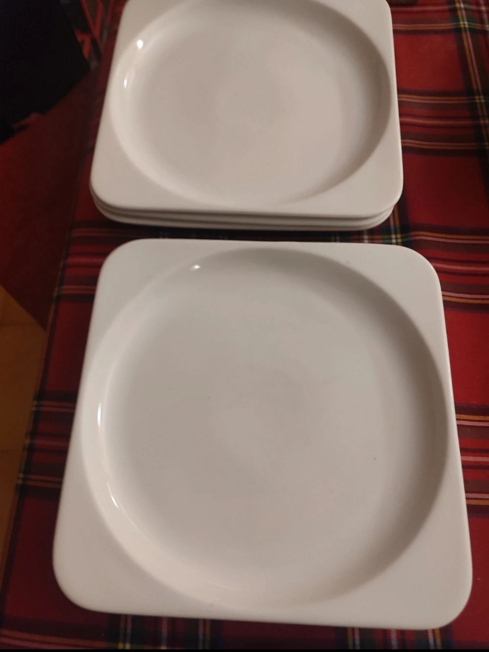 Descrizione: 6 piatti piani quadrati mis lato cm 21 causa inutilizzo porcellana bianca