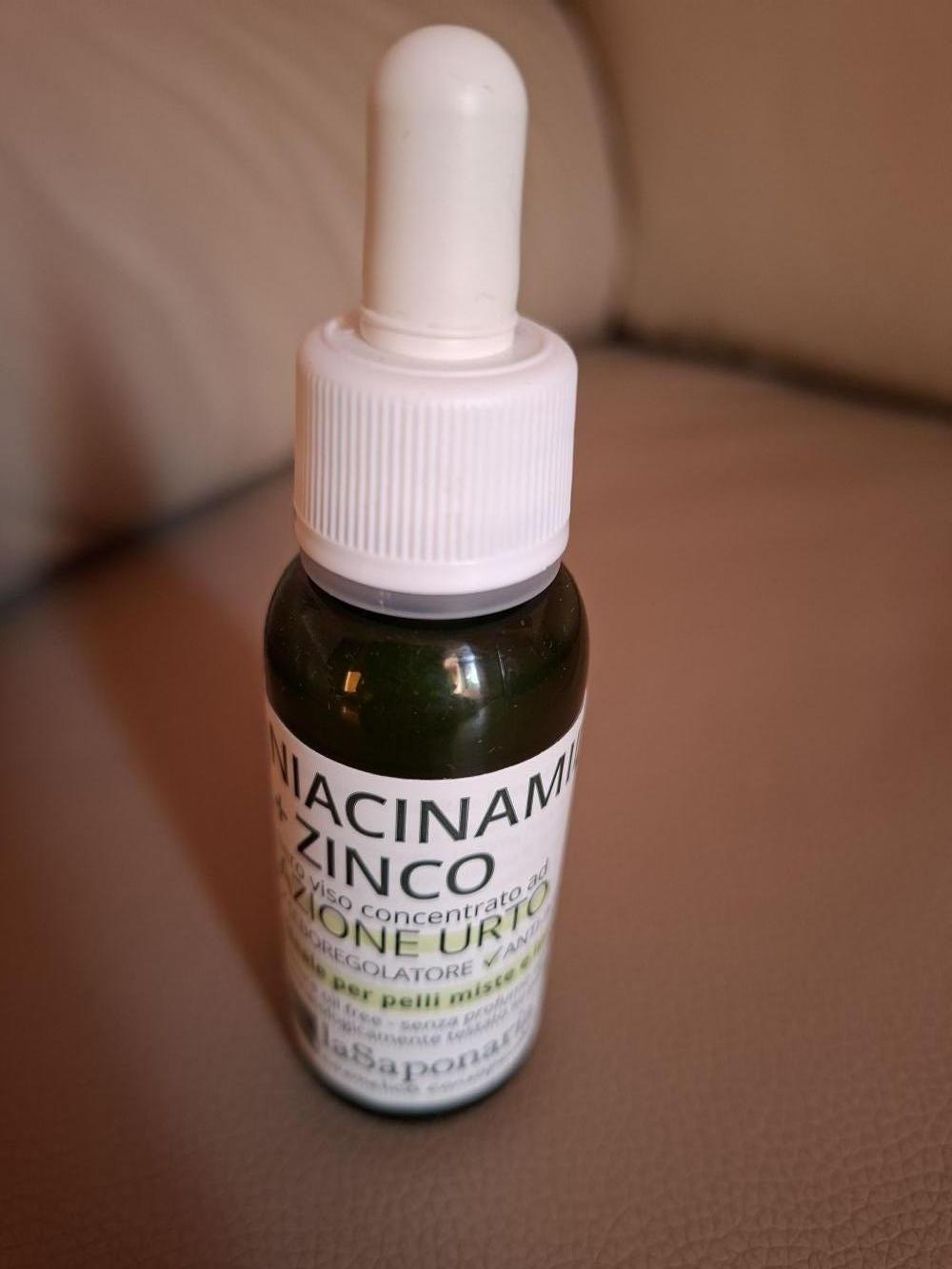 Descrizione:Siero viso concentrato ad azione urto,"niacinamide (vitamina B3)+zinco" di "LA Saponaria" in flacone da 30 ml (ne manca qualche goccia,utilizzata solo una sera).