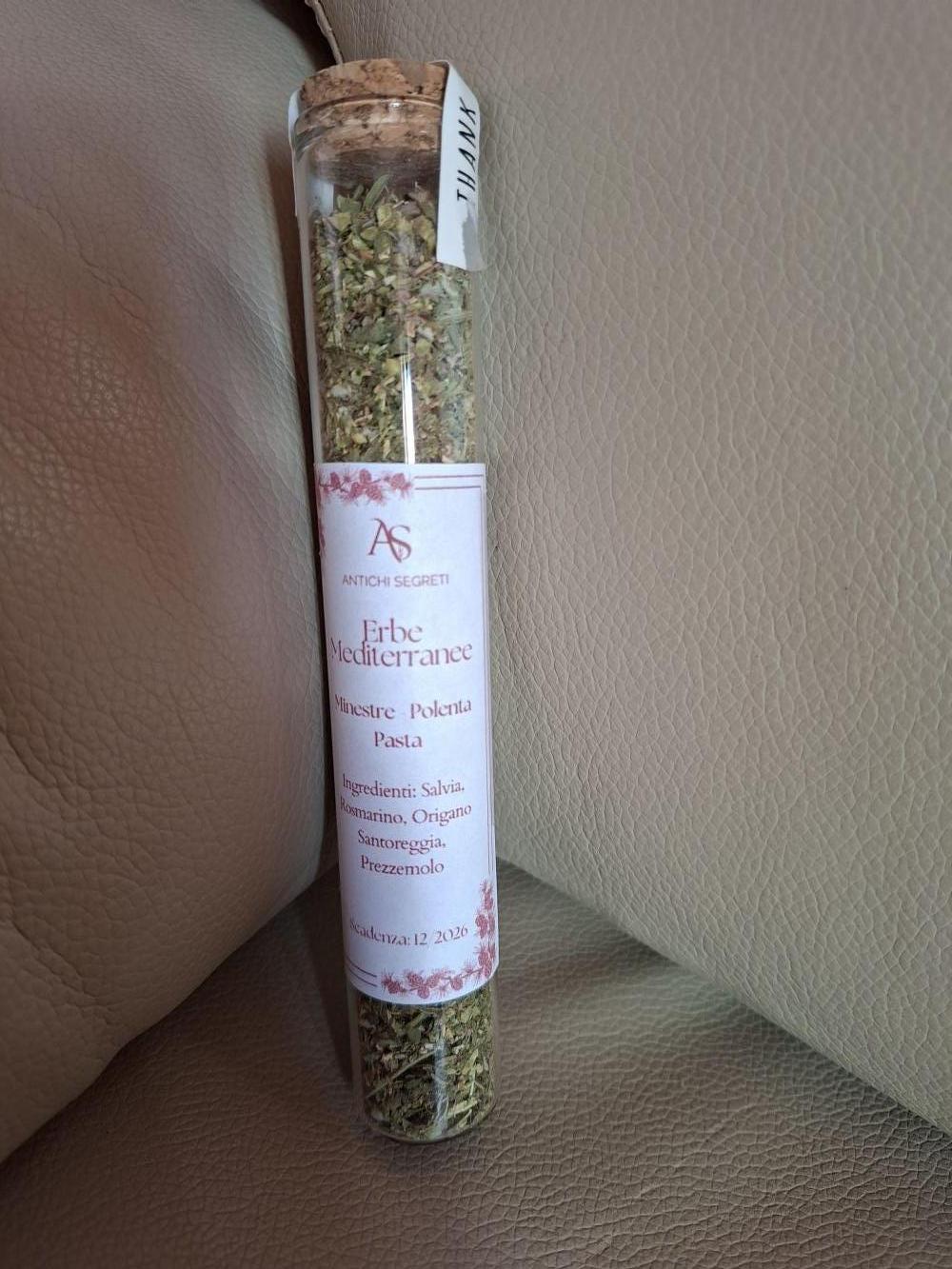 Descrizione:Erbe mediterranee (salvia,rosmarino,origano,santoreggia,prezzemolo)preparate dall'erborista e collocate in una bella boccetta di vetro con tappo di sughero.