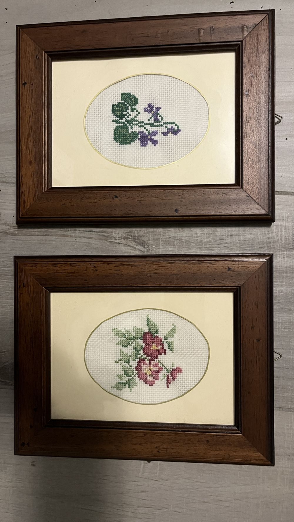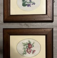 Descrizione:Due quadretti, cornice legno misura 20 × 30 con fiori ricamati a mano