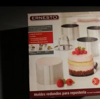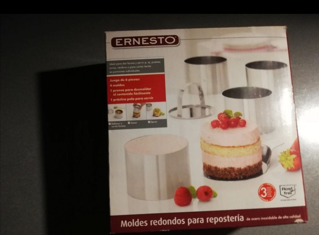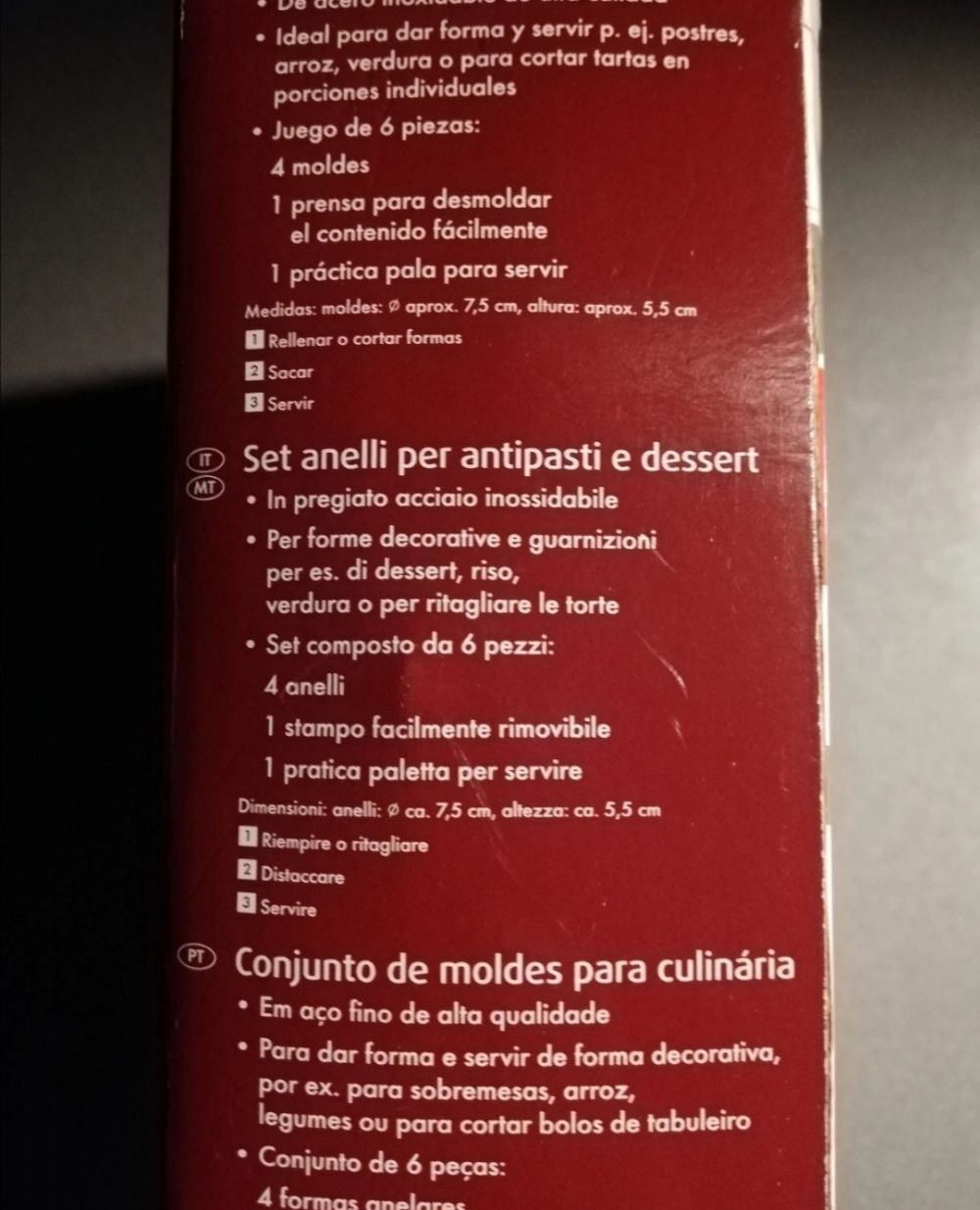 Set 4 anelli in acciaio per antipasti e dessert più 1 paletta e 1 stampo removibile. Confezione aperta per vedere il contenuto ma mai usato.