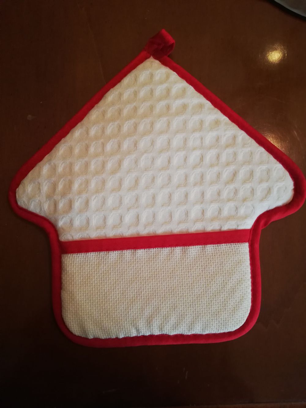 Descrizione:Presona a forma di casa in cotone e poliestere con tela Aida per il ricamo. Misure 27x25 cm