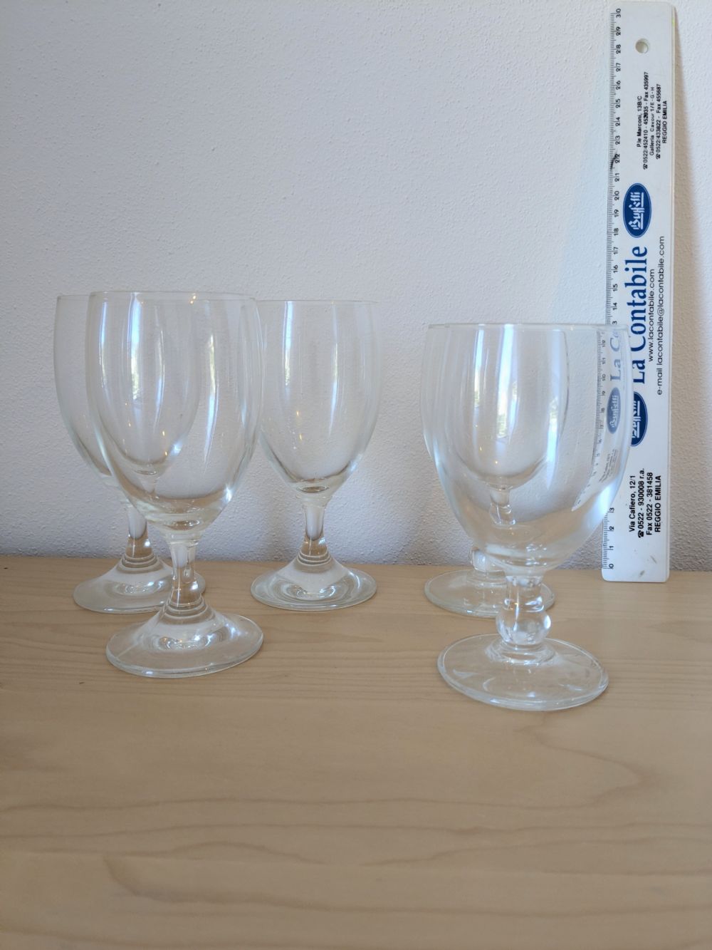 Descrizione:5 calici in vetro nessun difetto, di cui 3 da acqua e 2 da vino, la forma è la stessa quelli da vino come di consueto sono solo leggermente più piccoli