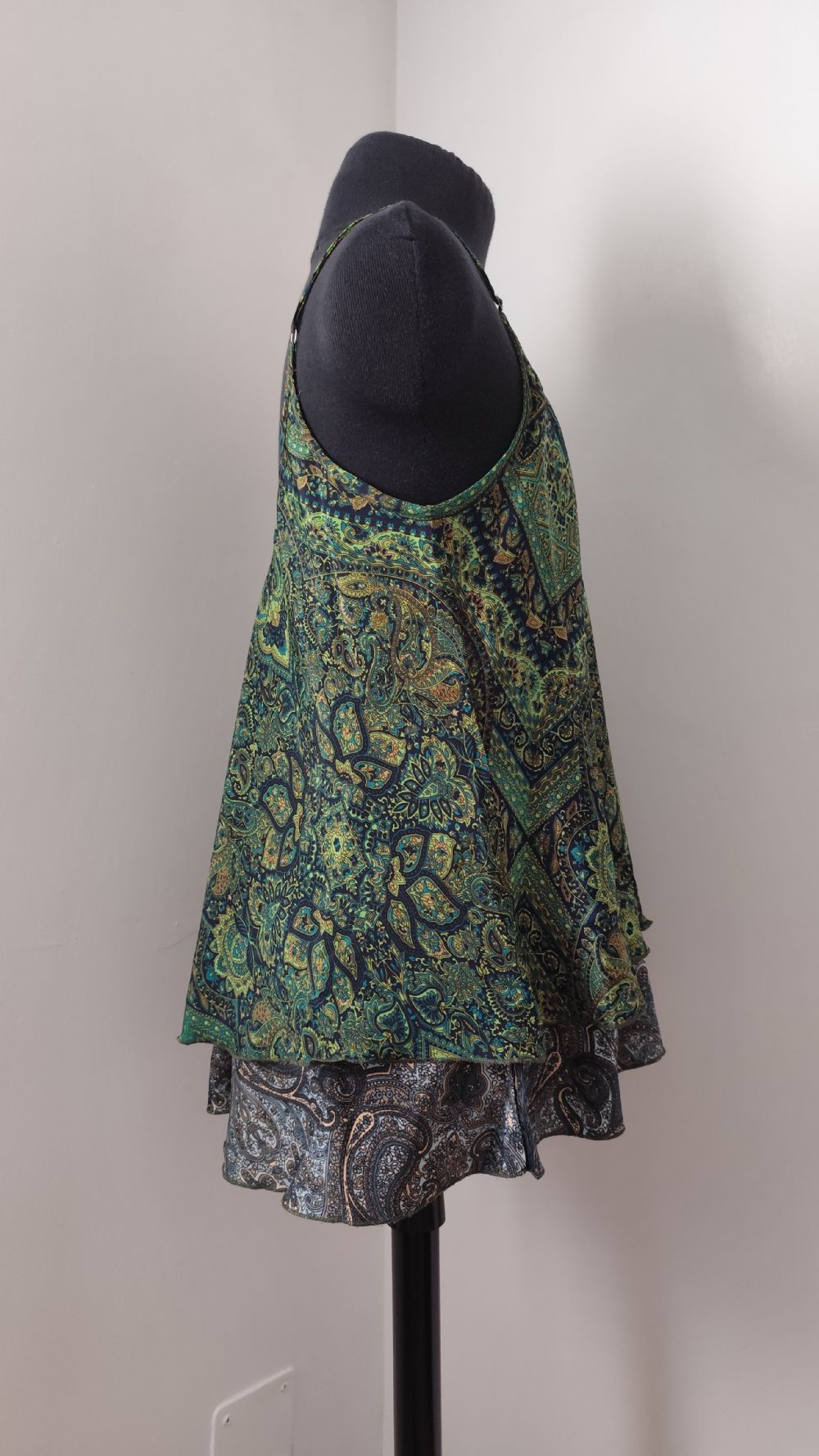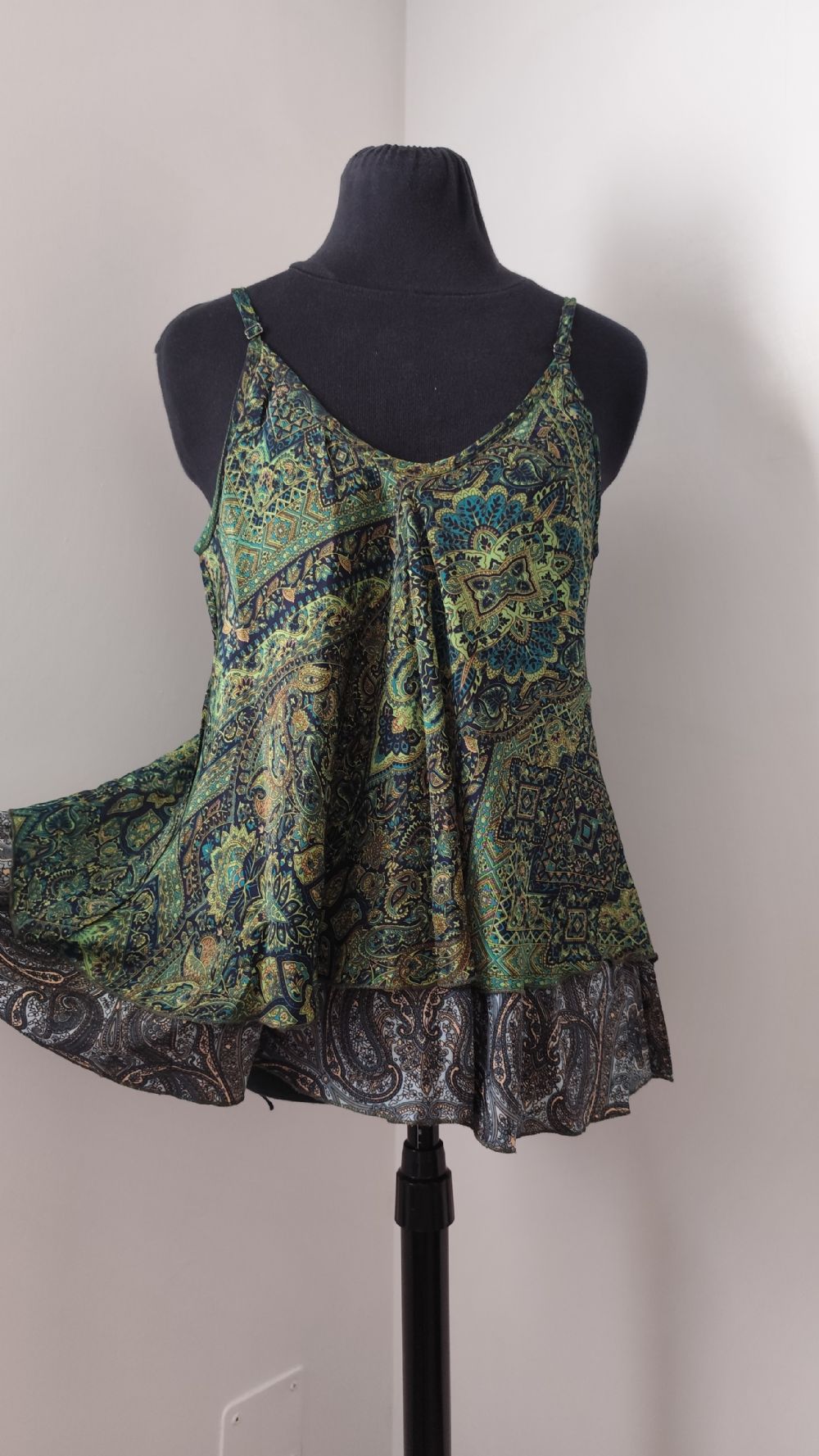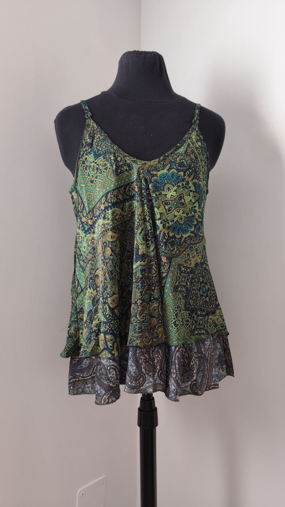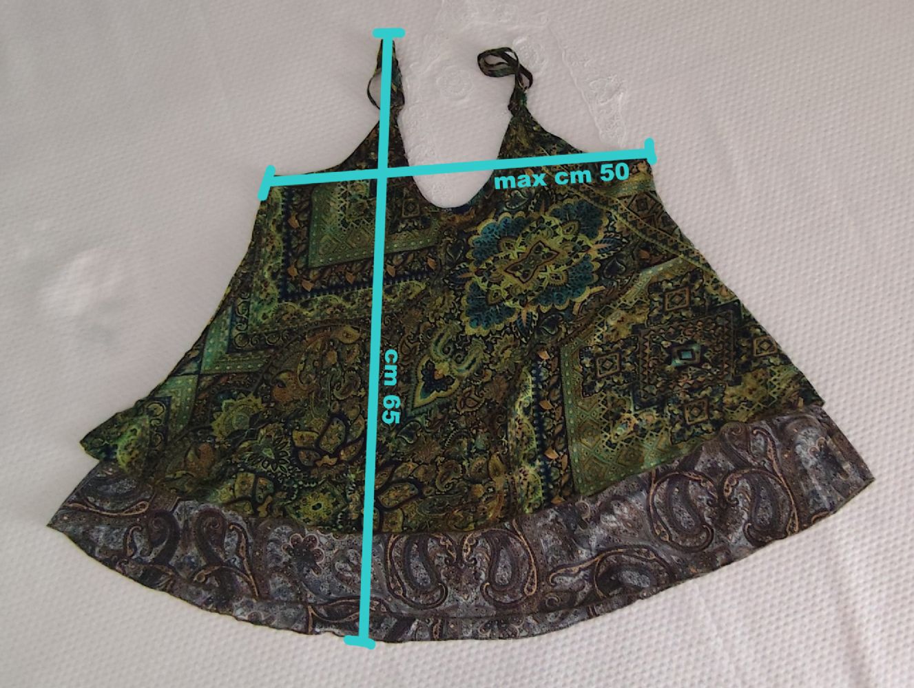 Descrizione:Bellissimo top realizzato in tessuto di raso, molto morbido e con taglio in sbieco che gli conferisce una vestibilità e una linea fuori dal comune, infatti può adattarsi bene a tutte le fisicità e scivola sul corpo realizzando un movimento fluido che si apre sul fondo. Composto da due strati di tessuto a fantasia paisley, uno sul verde e l'altro sul grigio, non è trasparente. Le spalline sottili e regolabili hanno in dettaglio i ganci in metallo.