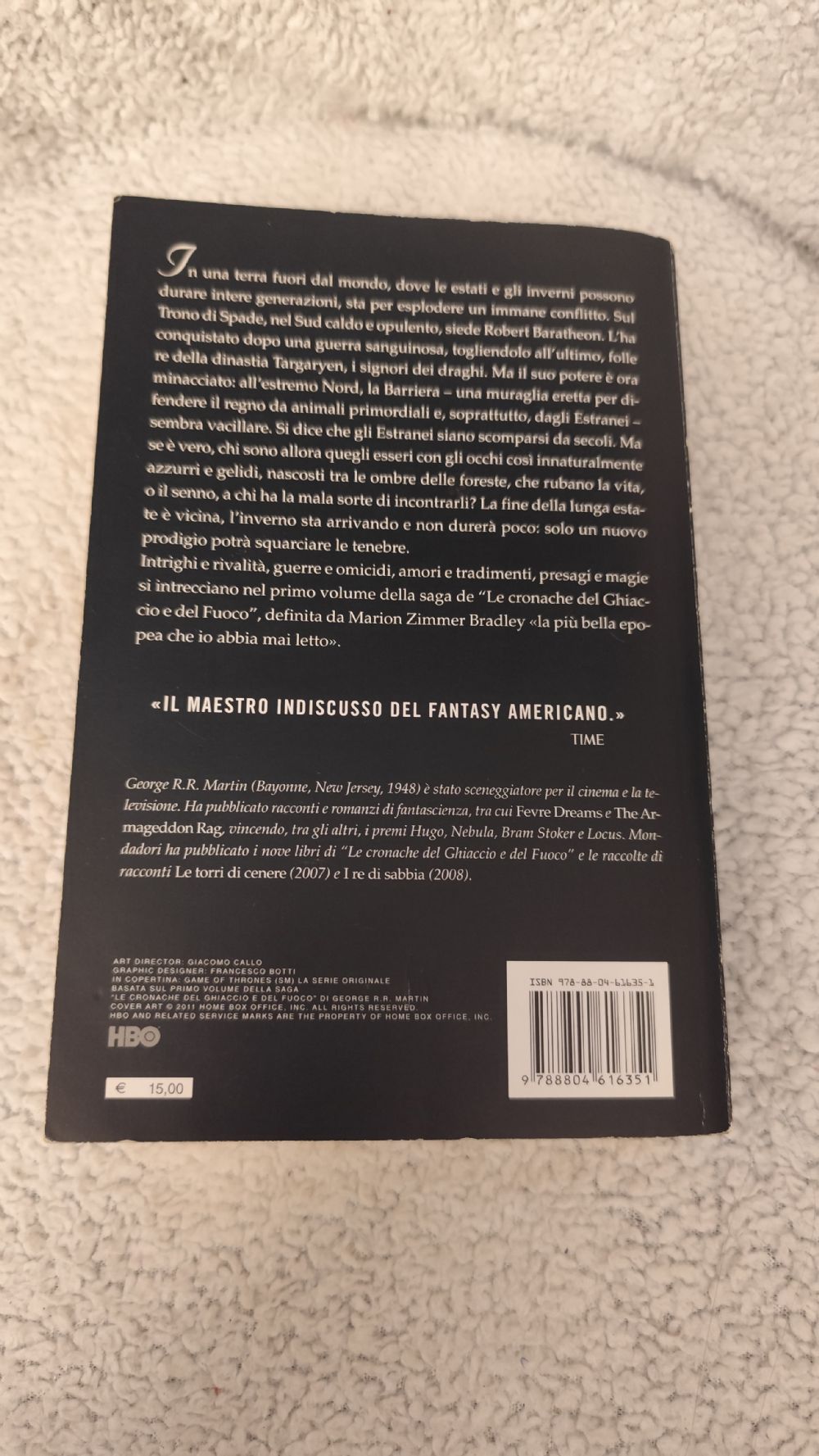In una terra fuori dal mondo, dove le estati e gli inverni possono durare intere generazioni, sta per esplodere un immane conflitto. Sul Trono di Spade, nel Sud caldo e opulento, siede Robert Baratheon. L'ha conquistato dopo una guerra sanguinosa, togliendolo all'ultimo, folle re della dinastia Targaryen, i signori dei draghi. Ma il suo potere è ora minacciato: all'estremo Nord, la Barriera - una muraglia eretta per difendere il regno da animali primordiali e, soprattutto, dagli Estranei -sembra vacillare. Si dice che gli Estranei siano scomparsi da secoli. Ma se è vero, chi sono allora quegli esseri con gli occhi così innaturalmente azzurri e gelidi, nascosti tra le ombre delle foreste, che rubano la vita, o il senno, a chi ha la mala sorte di incontrarli? La fine della lunga estate è vicina, l'inverno sta arrivando e non durerà poco: solo un nuovo prodigio potrà squarciare le tenebre. Intrighi e rivalità, guerre e omicidi, amori e tradimenti, presagi e magie si intrecciano nel primo volume della saga de "Le cronache del ghiaccio e del fuoco". Questa edizione presenta in un volume unico "Il trono di spade" e "Il Grande inverno", corrispondente al Libro primo delle Cronache del ghiaccio e del fuoco, così come concepito dall'autore.