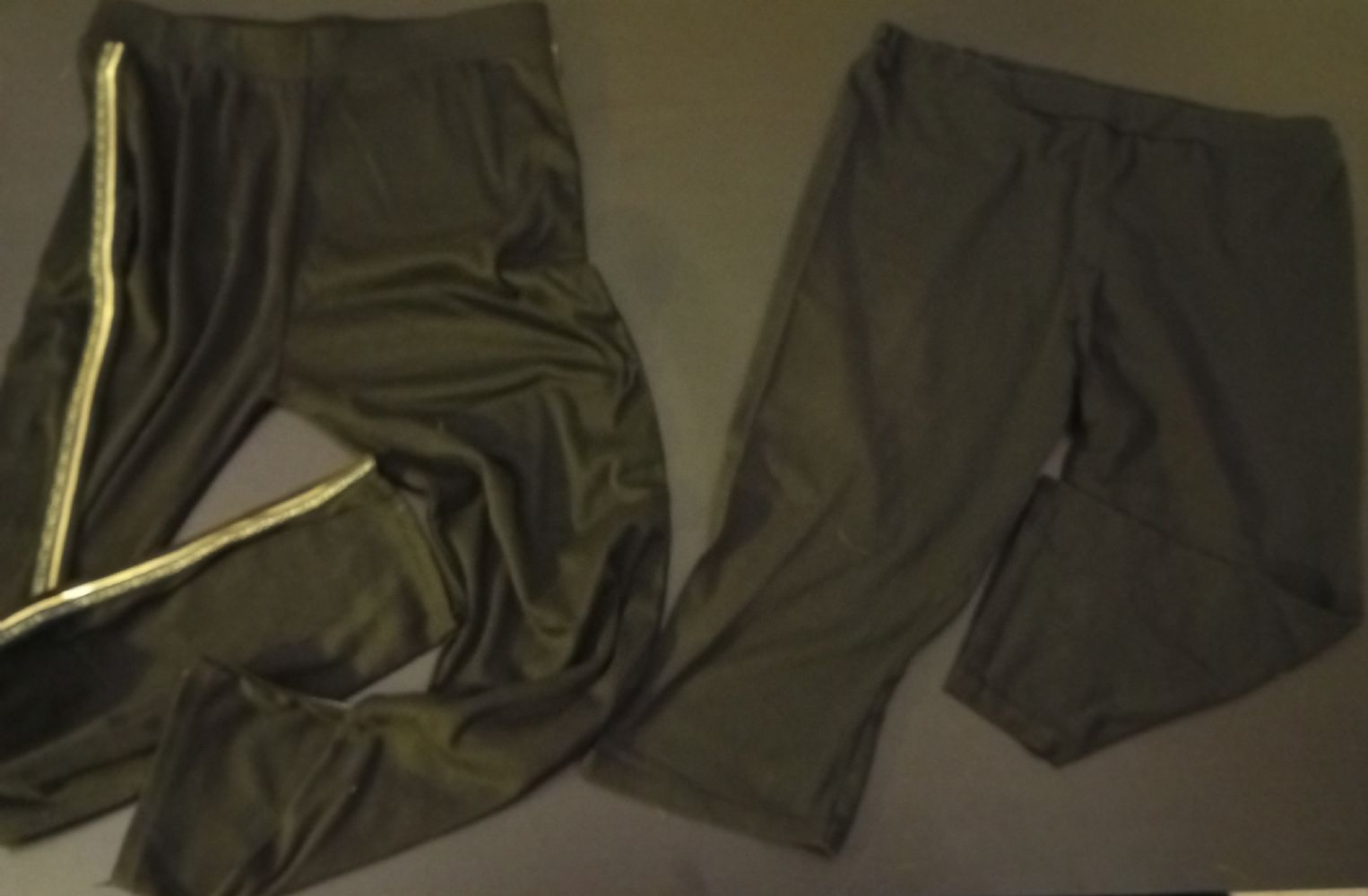 Descrizione:Eccellenti condizioni, a sinistra lunghi alla caviglia con bordo dorato e scritta (65 cotone 30 poliestere 5 elastane), a destra corti e sotto il ginocchio con elastico in vita un po' allentato (non c'è etichetta).
