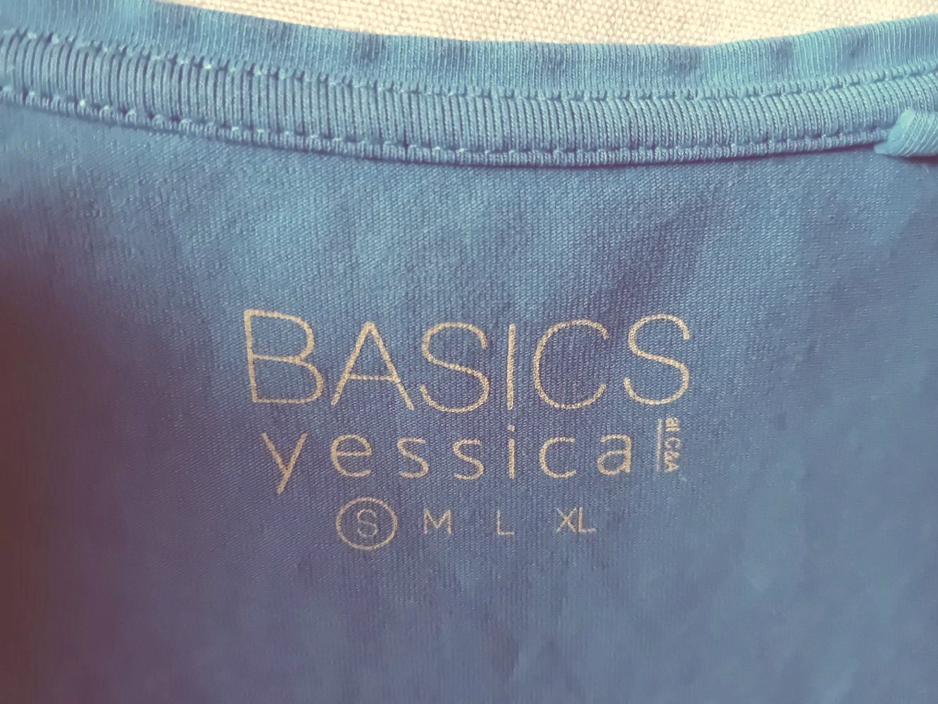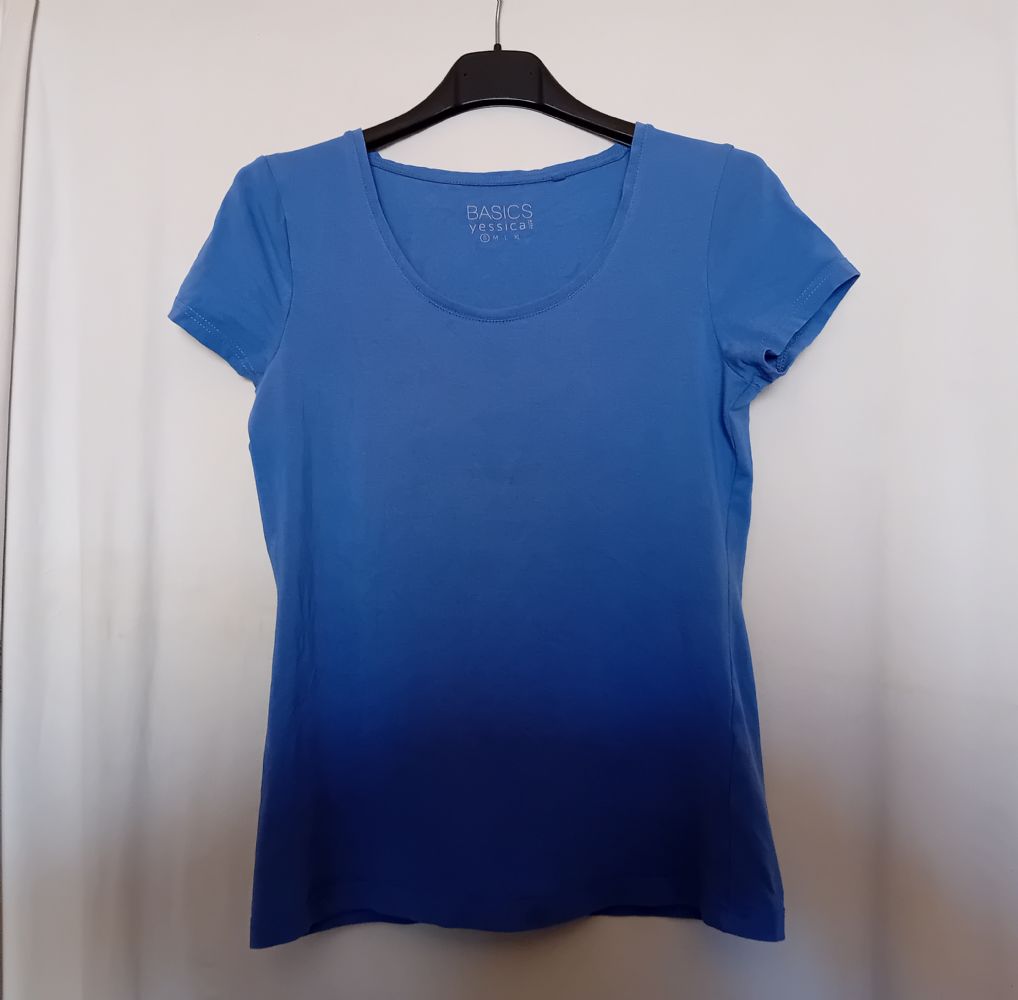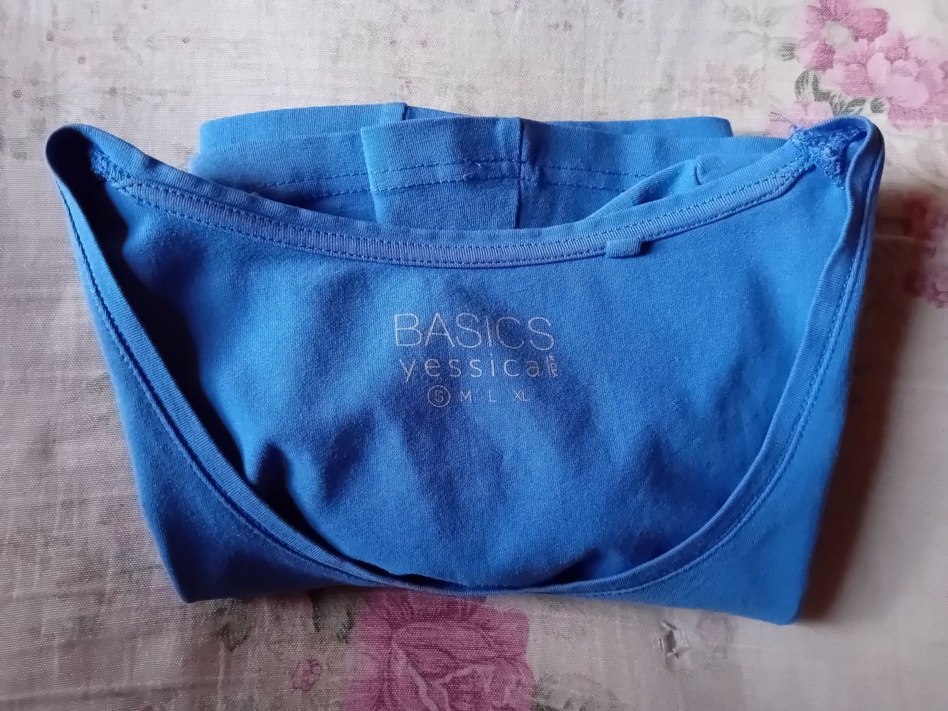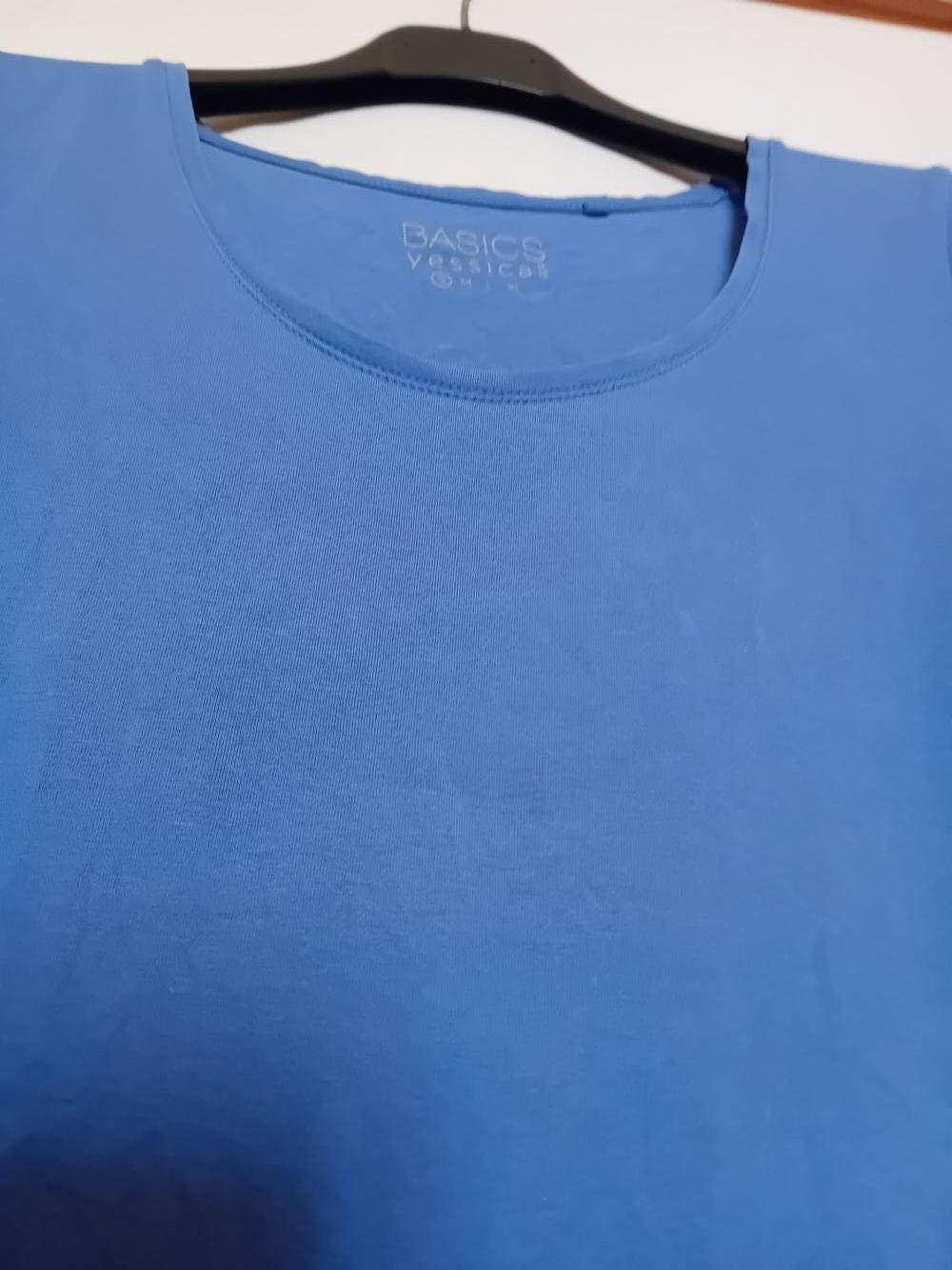 Descrizione:Yessica, etichetta tagliata ma è cotone elasticizzato, ascelle 40 cm. Azzurro chiaro carta da zucchero, non riesco a prenderlo. Ha un alone proprio in mezzo al petto, vedi anche foto 2, ma è poco visibile, è da usare ancora, magari per fare sport e simili.